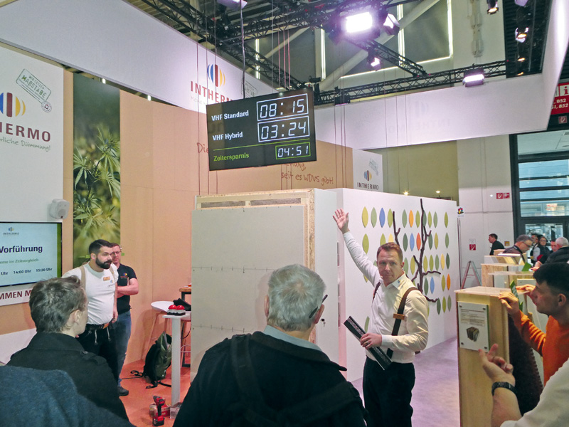 Neben den hellbraunen Hosenträgern des Inthermo-Teams stand vor allem die »VHF-Hybrid« im Mittelpunkt: Der Hersteller hatte pünktlich zur BAU den Prototypen einer neuen Holzfaserdämmplatte mit eingefrästen Lüftungskanälen sowie einer Putzträgerplatte aus Blähglasgranulat vorgestellt, die nun ihre angepriesenen Vorteile gegenüber eines klassischen VHF-Aufbaus unter Beweis stellen musste.