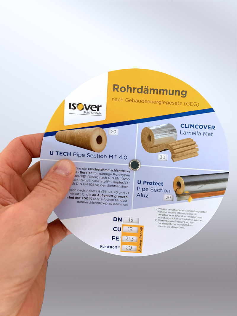 Das GEG sieht gegenüber der bis zu seiner Einführung geltenden Energieeinsparverordnung (EnEV) sowie des Energieeinsparungsgesetzes (EnEG) und des Energien-Wärmegesetzes (EE-WärmeG) im Bereich der Wärmedämmung von Rohrleitungen zunächst keine unmittelbaren Verschärfungen der energetischen Anforderungen vor. Entsprechend gelten die von ISOVER bisher empfohlenen und bewährten Dämmstoffdicken auch für zukünftige Projekte. Für deren Planung stellt die ab sofort erhältliche, handliche GEG Drehscheibe eine einfache, besonders übersichtliche und in der Praxis bewährte Entscheidungshilfe dar. Über die Auswahlfelder im unteren Bereich der Drehscheibe braucht lediglich der Außendurchmesser oder die Nennweite DN der zu dämmenden Rohrleitung eingestellt werden. Angezeigt werden dann die Mindestdämmschichtdicken für kaschierte und unkaschierte Mineralwolleschalen aus der nichtbrennbaren Hochleistungs-Mineralwolle ULTIMATE (U Protect Pipe Section Alu2 / U TECH Pipe Section MT 4.0) sowie für Lamellenmatten aus Glaswolle (CLIMCOVER Lamella Mat (ML 3)). Die praktische Drehscheibe ist kostenfrei über die entsprechenden regionalen ISOVER Gebietsleiter erhältlich (www.isover-technische-isolierung.de/kontakt).