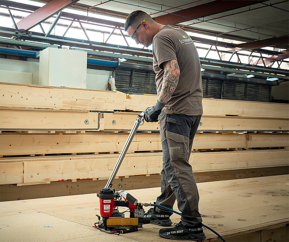 Der Haubold »Inliner« war nach Unternehmensangaben der Wegbereiter für eine halbautomatische wegkontrollierte Befestigung von OSB-, Gipsfaser- und Gipskartonplatten im Holzrahmenbau. Der neue »Speedliner 65« ermöglicht mit der Griffverlängerung eine ergonomische Arbeitshaltung, um Klammern und Nägel in definierten Abständen gemäß Eurocode 5 norm- und fachgerecht zu befestigen. Das 3-in-1-System reduziert die Kosten und erhöht die Flexibilität.