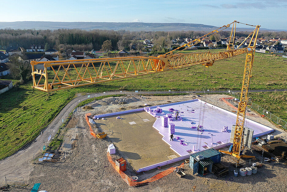 Die neue Sporthalle in dem Ort nahe Reims erfüllt als erste in Frankreich die Anforderungen des europäischen Passivhaus-Standards – und kommt mit ganzjährig konstanten 19 °C Innentemperatur ohne aktives Heizsystem aus. Möglich macht das ein durchdachtes Energiekonzept mit smarter Lüftung, Photovoltaik, Dachbegrünung und nicht zuletzt einer konsequent wärmebrückenfreien Bodenplattendämmung mit »Jackodur Atlas«.
