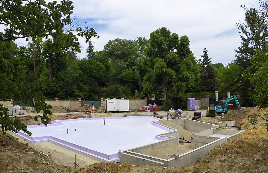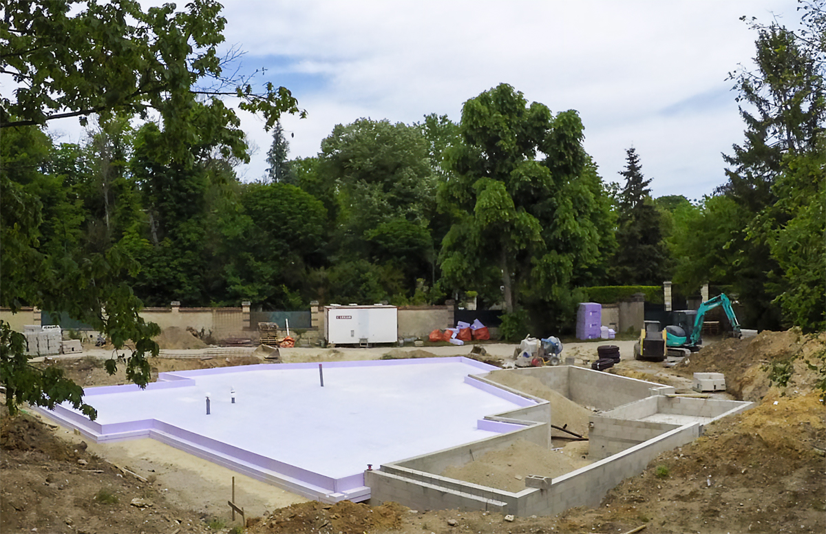 Beim Projekt in Le Vésinet kamen 300 m² »Jackodur KF 700« zum Einsatz – und es wurde deutlich, wie entscheidend die Wahl der richtigen Dämmstrategie ist. Das wirkt sich nicht nur enorm auf die Bauqualität aus, sondern auch auf den Wohnkomfort und den langfristigen Energieverbrauch. Die XPS-Dämmplatten von »Jackodur« zeichnen sich durch hohe Dämmleistung, Formstabilität, Druckfestigkeit, geringes Gewicht und Feuchteunempfindlichkeit aus. Damit sind sie optimal für stark belastete Bauteile wie Bodenplatten geeignet.