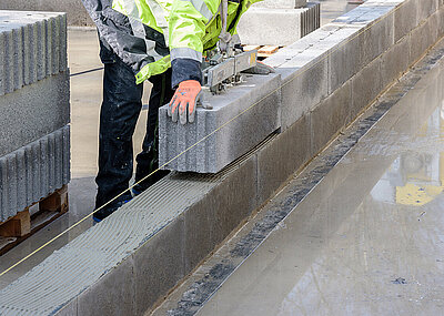 Beide Varianten haben eine Steinlänge von 99,7 cm und eine Höhe von 24,9 cm. Aufgrund dieser Maße kann ein »Quadro Lang« bis zu vier herkömmliche Einzelsteine ersetzen. Pro Quadratmeter Mauerwerk sind nur noch vier Hub erforderlich. Dabei bleibt der Stein trotz seiner außergewöhnlichen Länge im gewohnten Raster der DF-Formate und kann mit anderen Jasto-Steinen kombiniert werden. Mit dem »Quadro Lang« lassen sich die üblichen Geschoss- und Brüstungshöhen ohne Mehraufwand realisieren. Die Arbeitsabläufe auf der Baustelle werden erheblich beschleunigt und die Arbeitskräfte können effizienter eingesetzt werden. Gleichzeitig trägt das System auch zur Gesundheit der Mitarbeiter bei, denn die großen Steine werden rückenschonend mit einem Kleinkran versetzt. Die körperliche Belastung sinkt aufgrund der maschinellen Unterstützung deutlich.