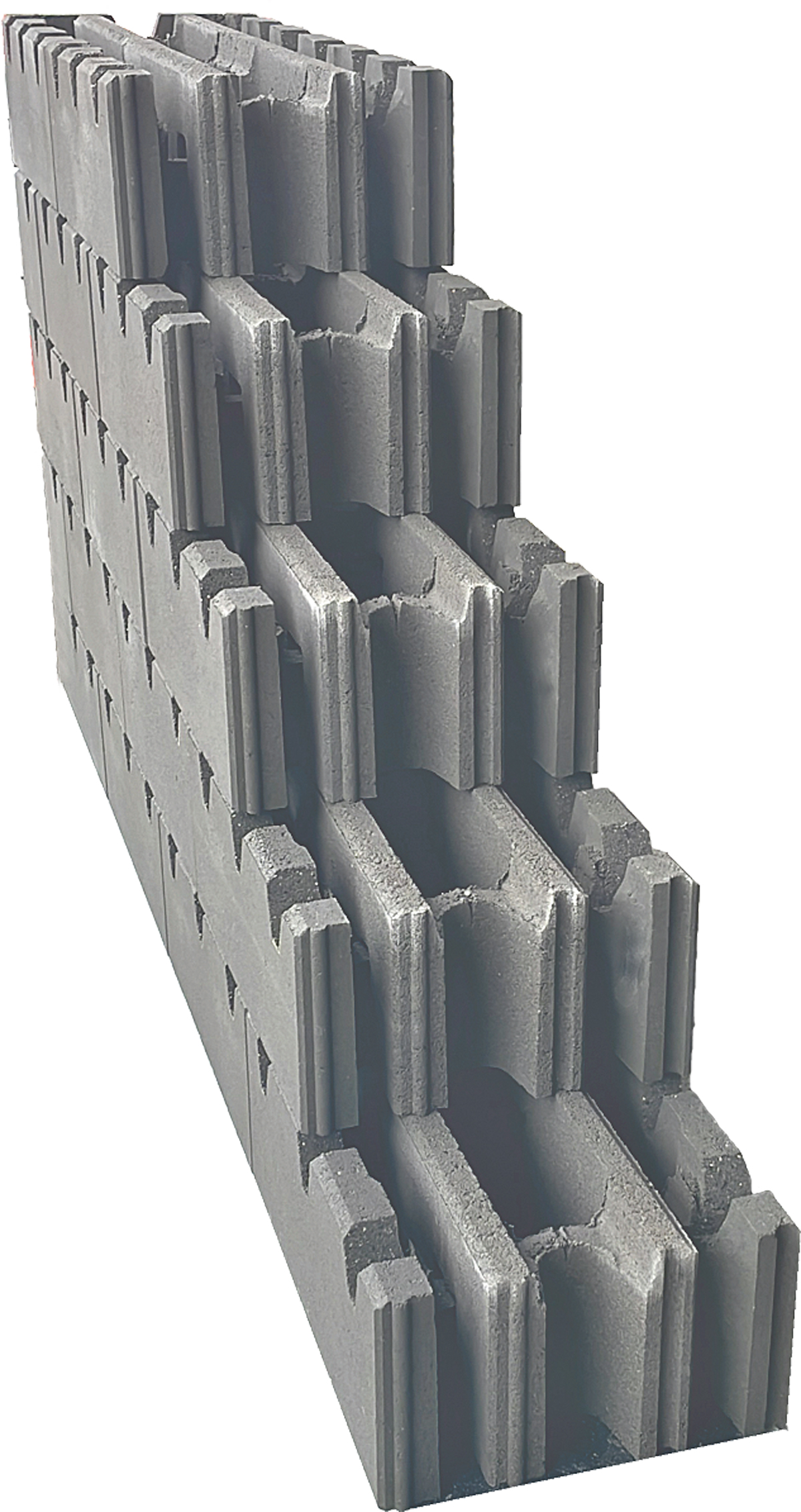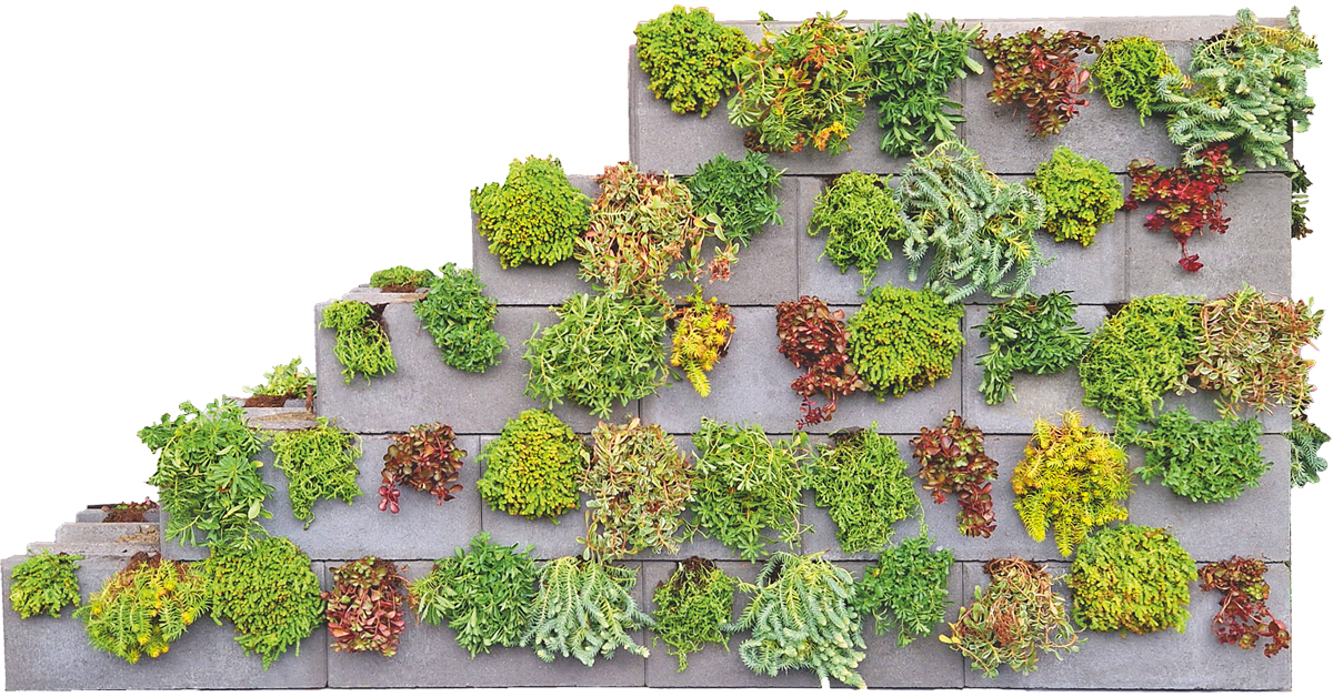 Die Steine des Mauersystems verfügen über drei nebeneinander liegende Kammern mit unterschiedlichen Funktionen. Die beiden äußeren Kammern können mit Pflanzsubstrat befüllt und individuell bepflanzt werden. Über integrierte Aussparungen an der Oberseite jedes Steins wachsen die Pflanzen dann nach außen. Hierfür eignen sich z. B. Sedum-Pflanzen, die an vertikalen Wandflächen gut gedeihen. Die innere Kammer hingegen kann ausbetoniert und armiert werden, um so die statische Belastbarkeit der Mauer zu erhöhen. Auf diese Weise sind freistehende Mauerhöhen von bis zu 2 m möglich.