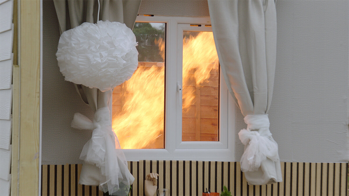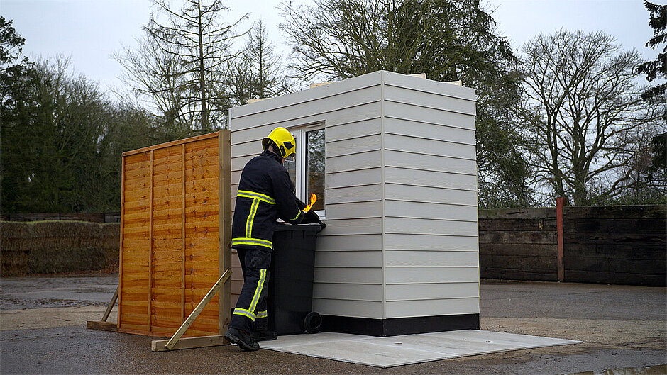 Um das Brandverhalten verschiedener Fassadenmaterialien objektiv zu bewerten, hat James Hardie eine kontrollierte Demonstration durchgeführt. Im Fokus standen dabei die 8 mm starken »Hardie Plank«-Faserzementpaneele im Vergleich zu konventionellen Wandbekleidungen aus Holz und Kunststoff. Für die Demonstration wurden drei identisch konstruierte Baukörper errichtet, die sich lediglich in der äußeren Fassadenbekleidung unterschieden. Auf der Innenseite wurde eine realitätsnahe Wohnsituation nachgestellt – mit Schreibtisch, Stuhl, Tapeten und Fensterdekoration. Vor jeder Fassade wurde eine Mülltonne mit brennbaren Materialien platziert und unter exakt gleichen Bedingungen entzündet. Die Ergebnisse der Branddemonstration wurden im Video dokumentiert.