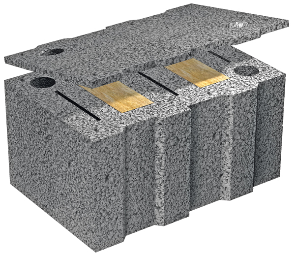 Neu ist auch, dass die optimierten Thermsteine nun einen »Deckel« haben. Auf der Baustelle schützt dieser Deckel den integrierten Dämmstoff durch eine Leichtbetonschicht vor mechanischen Beschädigungen und Witterungseinflüssen. Dünnbettmörtel lässt sich durch den planebenen Deckel noch einfacher als bisher vollflächig auftragen.