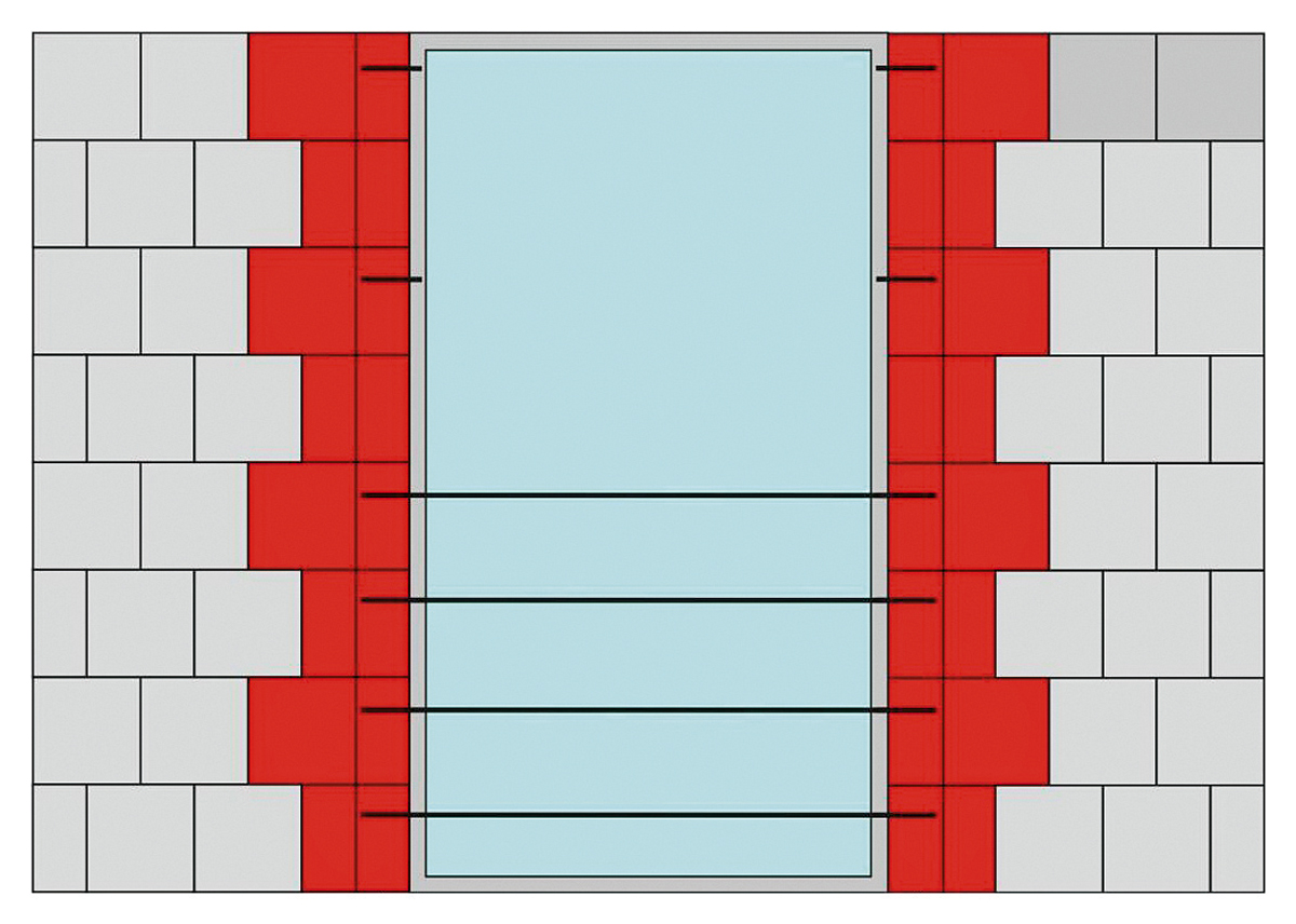 Die Besonderheit des System-Laibungspakets: Es kombiniert einen für den Wärmeschutz optimierten Steinbereich mit Luftschlitzen und einen massiven Vollstein. Beide Bereiche werden als Einheit produziert und laufen als ein kompletter Stein vom Band. Der massive Anteil von 12,5 cm Wanddicke über die komplette Steinhöhe der Laibungssteine gewährleistet, dass die Befestigung über die gesamte erforderliche Verankerungstiefe in vollem Material erfolgt. Dadurch ist der Stein höheren Lasten gewachsen. Den Übergang zwischen den Bereichen markiert eine seitlich angebrachte Nut, die auch in vermauertem Zustand sichtbar bleibt.