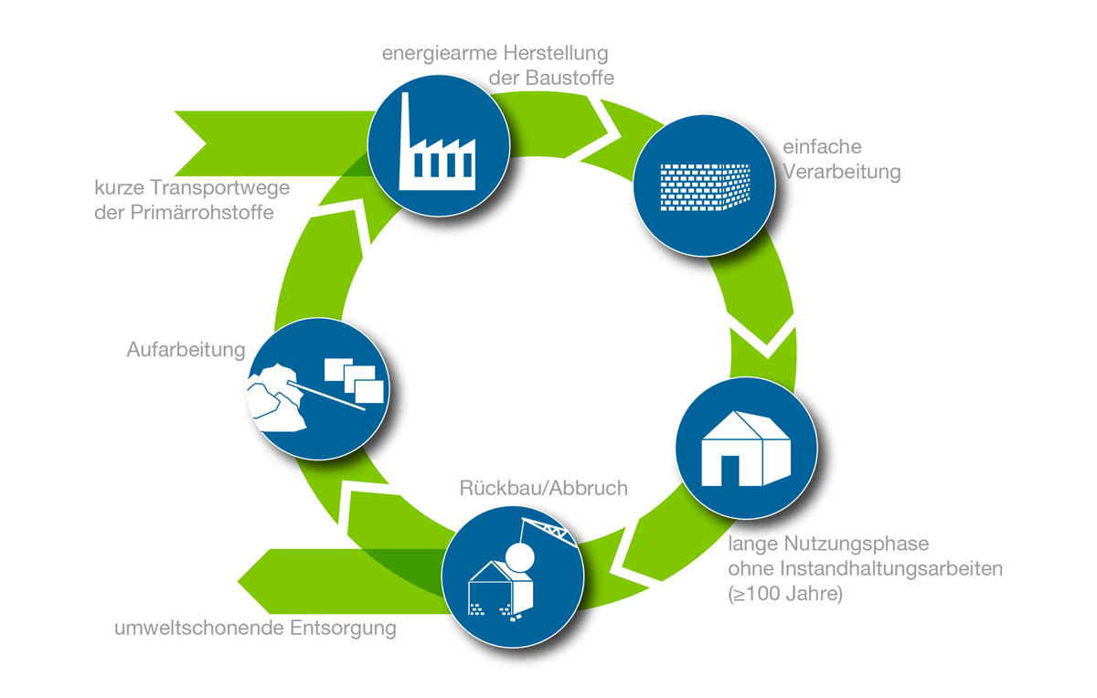 Aufgrund eines besonders energiearmen Herstellungspro-zesses heben sich Baustoffe aus Leichtbeton deutlich von allen anderen massiven Wandbaustoffen ab. Eine Lebens-zyklus-Analyse des Instituts für Bauen und Umwelt e.V. (IBU) bestätigt die hervorragende Ökobilanz des Baustoffs mit entsprechenden Umweltproduktdeklarationen (EPD). Der Nachhaltigkeitsbericht stellt hierzu detaillierte Ver-gleichszahlen bereit. Besonders aufschlussreich ist der Vergleich von praxisrelevanten Wandkonstruktionen. Dabei werden auch die Putzschichten und die bei manchen Bau-stoffen erforderlichen Wärmedämmsysteme einbezogen. Aufgrund der energieeffizienten Herstellung und der Mög-lichkeit, mit rein monolithischen Wandkonstruktionen einen hohen Wärmeschutz zu verwirklichen, lässt Mauerwerk aus Leichtbeton andere Wandbaustoffe deutlich hinter sich.