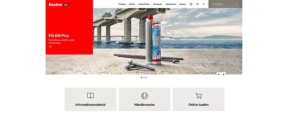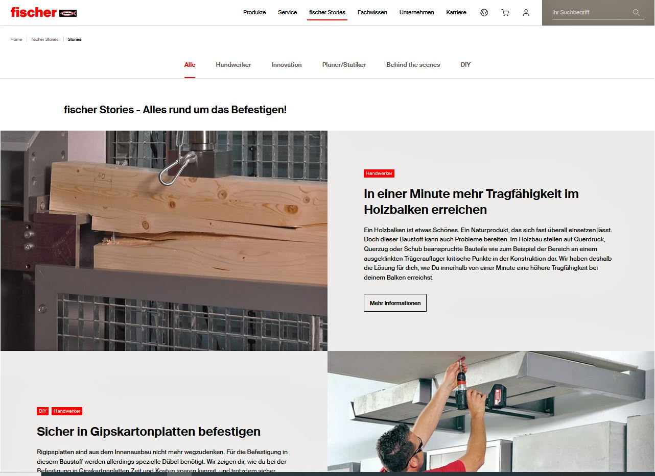 Mit den „fischer Stories“ kommt ein Navigationspunkt hinzu, unter welchem Besucher unterschiedliche Hintergrundgeschichten und wertvolle Anwendungstipps rund um die Befestigungstechnik entdecken können. Montageaufgaben und Themen aus dem Baustellenalltag professioneller Handwerker gehören genauso dazu wie Tipps und Tricks für Do-it-Yourselfer zur Gestaltung ihres Zuhauses. Statiker, Bauingenieure und Planer können sich zudem auf den neuesten Stand zum aktuellem fischer Produkt- und Anwendungsspektrum sowie zu geltenden Vorschriften bringen, oder auch einen Blick hinter die Kulissen der Forschungs- und Entwicklungsarbeit bei fischer werfen. Interessenten finden hier auch ausführliche Reportagen zu fischer Referenzprojekten weltweit. Ein weiterer neuer Navigationspunkt ist das „Fachwissen“, wo Besucher auf verschiedene Anwendungen und Gewerke abgestimmte fischer Sortimente finden, wie Fassaden- und Installationssysteme oder Befestigungslösungen für Wärmedämmverbundsysteme. Wie gewohnt, ist die Website zudem mit dem myfischer Partnerportal verknüpft. Auch der fischer YouTube Kanal DIE FESTMACHER ist mit einem Klick erreichbar. Zugriff auf meistgenutzte Funktionen und Inhalte haben Besucher direkt von der Startseite aus. Dazu gehören Downloadmaterial, die fischer FiXperience Bemessungssoftware, die Technische Beratung, das Online- und Präsenz-Schulungsprogramm der fischer Akademie oder auch die Innovationen und Highlights aus dem fischer Produktspektrum. Ebenso von der Startseite aus können Besucher ihren Online-Einkauf starten, haben aber auch Direktzugriff auf die Händlersuche zum Auffinden der Geschäfte von fischer Partnern in örtlicher Nähe.