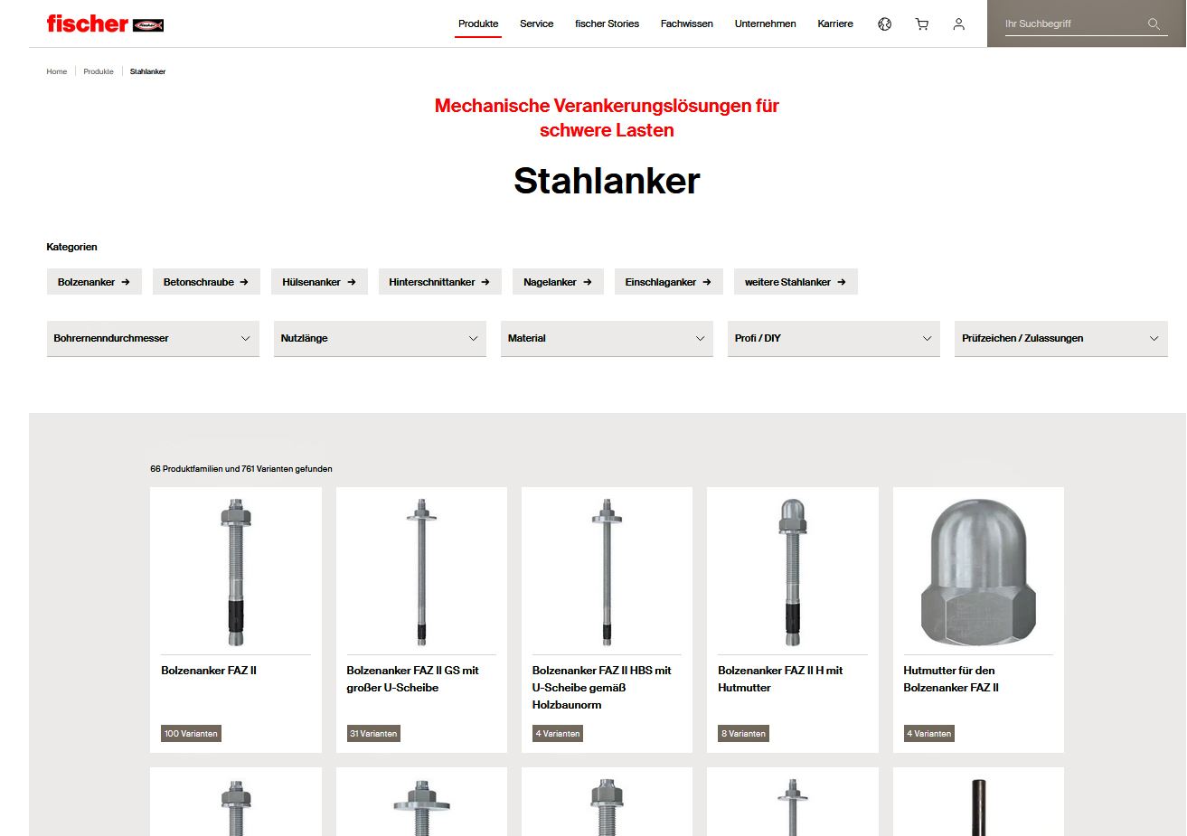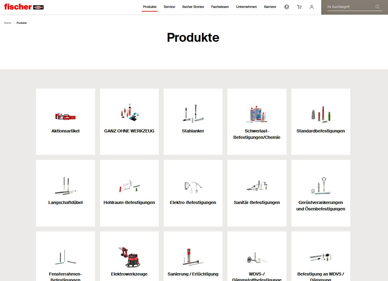 Bei der Neugestaltung der Website standen vor allem die Kundenbedürfnisse und die verstärkte Ausrichtung auf das Nutzerverhalten im Fokus. Neben der verbesserten Navigationsstruktur haben Besucher auch dank des optimierten Produkt-Onlinekatalogs mit übersichtlicher Darstellung alle Produktkategorien auf einmal im Blick und gelangen mit wenigen Klicks zur jeweils geeigneten Befestigungslösung. Nur einen Schritt weiter sind weitere Inhalte, zum Beispiel die zugehörige Montageanleitung sowie Angaben zu den Anwendungen und Zulassungen abrufbar. Um ihren Einkauf abzuschließen, gelangen Kunden per „Retail Connect“ in den Online-Shop der angebundenen fischer Handelspartner, können aber genauso die lokale Händlersuche auf der Website nutzen, um die Produkte stationär zu erwerben. Auch durch die verbesserten Filtermöglichkeiten sparen Besucher Aufwand und Zeit bei der Suche nach geeigneten Befestigungsmitteln. Zusätzlich vereinfacht und beschleunigt die optimierte mobile Version des Produkt-Onlinekatalogs die Produktrecherche mit mobilen Geräten von unterwegs. Die Serviceleistungen wurden zielgruppengerecht gebündelt. Etwa gelangen Planer und Statiker im Bereich „Service“ unter „Planungshilfen“ zu allen relevanten Tools und Informationen. Genauso verfügen Händler und Handwerker über ihre eigenen Unterseiten, auf denen die vielen verschiedenen Möglichkeiten der Unterstützung übersichtlich aufgeführt sind.