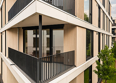 Ein besonderes Türen-Highlight ist die Gestaltung der Lift-Lobby auf den 16 Etagen. Hier sorgen insgesamt 32 flächenbündig verbaute Blockrahmenelemente in Eiche furniert, die sich zu 90° öffnen lassen, für eine flächenbündige Optik der hier ausgeführten Vorbauwand. »Durch die Harmonie der Holzoberflächen sowie die technische Umsetzung der Jeld-Wen-Türenanlage konnten wir das gewünschte Gestaltungskonzept eins zu eins umsetzen«, erläutert Jens Bösenberg von WBO. »In diesem Kontext spielte es auch eine wichtige Rolle, dass die insgesamt 126 Wohnungseingangstüren die gleiche Optik aufweisen wie die Vorwand im Aufzugsbereich. Genau aus diesem Grund wurde die Oberfläche mehrfach vonJeld-Wen bemustert, um hier ein harmonisches Gesamtbild zu erreichen.«