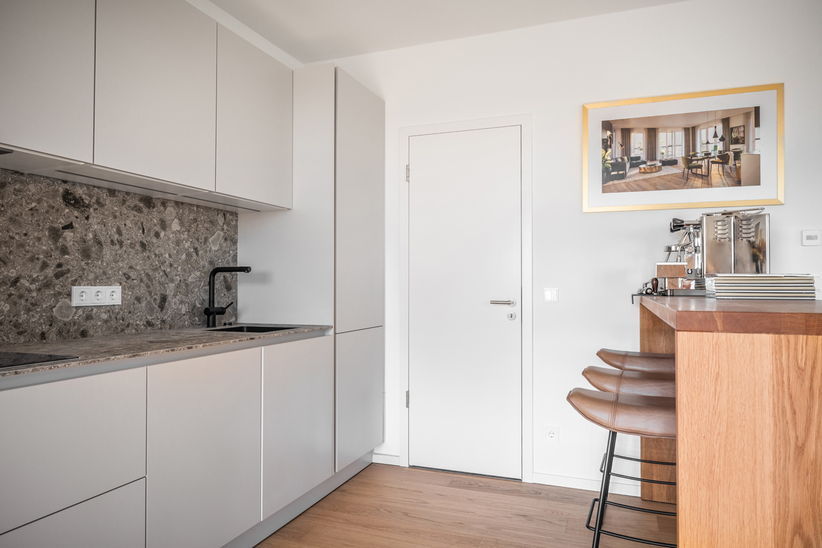 Auch im Innenbereich wurde der nachhaltige Ansatz konsistent verfolgt. Ausgewählte Baumaterialien, darunter die hochwertigen Innentüren von Jeld-Wen, fördern aktiv ein wohngesundes Raumklima. »Aus architektonischer Sicht spielt die Auswahl der Innentüren eine wesentliche Rolle für die funktionale, ästhetische und auch nachhaltige Qualität eines Gebäudes«, sagt Kasimir Altzweig, Architekt und Mitinhaber des Architekturbüros Störmer, Murphy and Partners. »Sie sind weit mehr als nur Raumtrenner: Die Türen beeinflussen maßgeblich das Raumklima, die Akustik und die Sicherheit der Bewohner.«