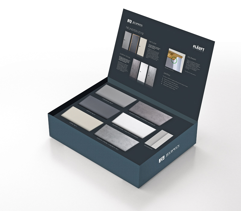 Die mehrstufige »#Läuft«-Kampagne ist so aufgebaut, dass zuerst dem qualifizierten Fachhandel die Möglichkeit geboten wird, sich auf die Nachfrage der Verarbeiter einzustellen. Hierfür bietet das Unternehmen Mustertüren aller betreffenden Oberflächen, die kurzfristig in die bestehende Ausstellung des Händlers integriert werden können. Weitere verkaufsfördernde Unterlagen – wie Endkunden-Kataloge oder Oberflächenmuster – komplettieren die Ausstattung für den POS und bereiten den Fachhandel für die Nachfrage interessierter Verarbeiter vor. Im Mittelpunkt der Kampagne stehen die modernen Mattlack-Oberflächen (»Creme ML01«, »Staubgrau ML37«, »Graphit ML24«) des Herstellers sowie die Betonoptiken (»DuriTop Spezial Concrete Anthrazit«, »Concrete UltraWeiß« und »Concrete hell«).