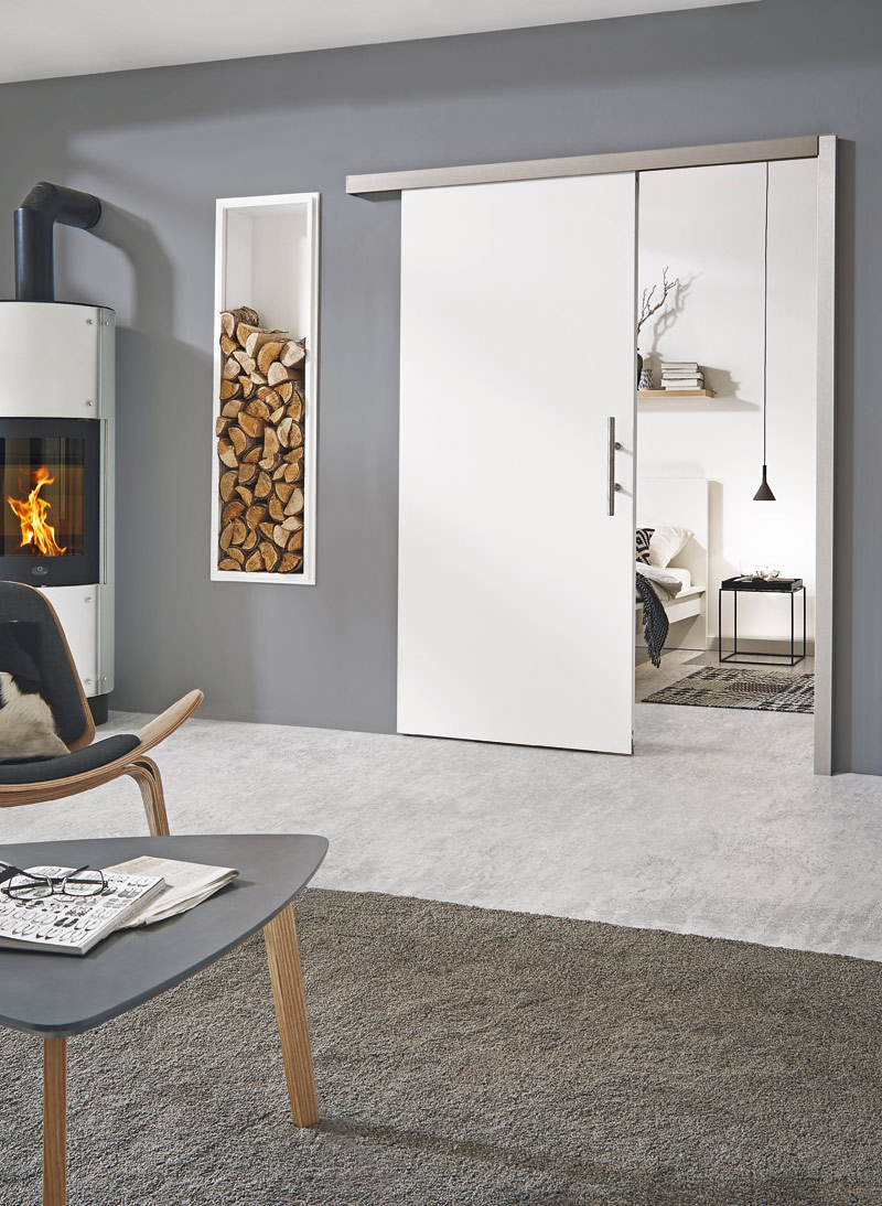 Die Jeld-Wen-Schiebetür »Edelstahl« wird vor der Wand laufend eingesetzt. Der sichtbare Mechanismus verleiht der Tür mehr Leichtigkeit und sie wird zu einem eleganten Blickfang im Raum.