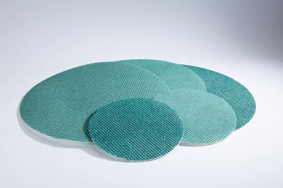 Außer Papierschleifscheiben werden im Trockenbau auf den Langhalsschleifern auch Schleifgitter-Scheiben und in letzter Zeit sogenannte Schleifnetze eingesetzt. »Wir haben festgestellt, dass diese Produkte jedoch gegenüber der perforierten Papierschleifscheibe gewisse Nachteile hinsichtlich Abtragsleistung, planem Schleifergebnis und Schleifleistung haben«, erklärt Jöst. »Auch sind diese Alternativen in der Regel nicht in groben Körnungen wie zum Beispiel 40 und 60 lieferbar.«