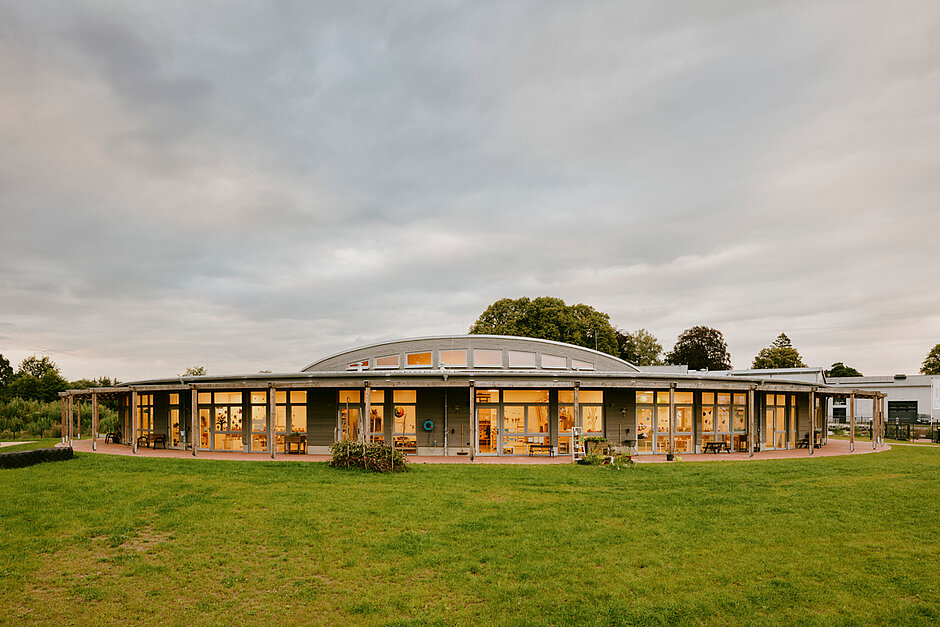Die Gruppenräume des Kindergartens sind radial angeordnet und orientieren sich zum großzügigen Außenspielbereich, während ein multifunktionaler zentraler Raum das Herzstück des Gebäudes bildet. Dieser Raum ist nicht nur Verkehrsfläche, sondern auch Bewegungsraum und Garderobe. Eine vorgelagerte Terrasse mit einer Pergola aus sibirischer Lärche bietet zusätzlichen Raum zum Spielen und Verweilen im Freien. Gleichzeitig schützt sie vor zu intensiver Sonneneinstrahlung und leistet so einen Beitrag zum angenehmen Raumklima.