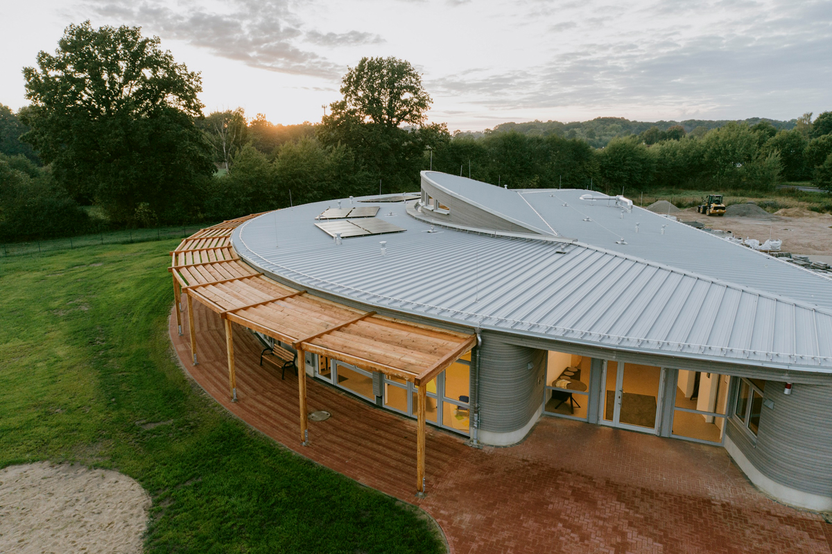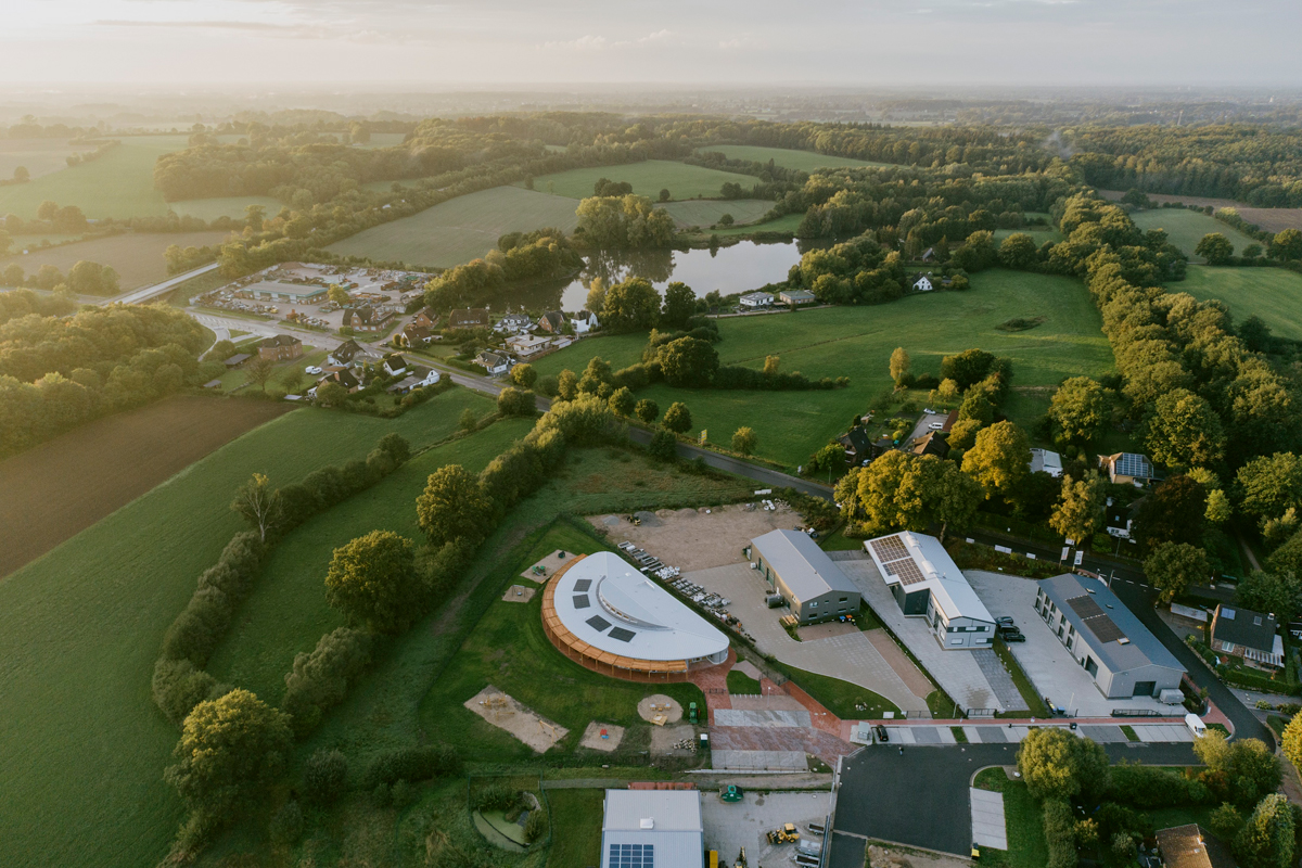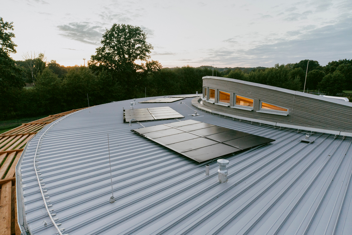 Die Planer wählten bewusst Aluminium als Material für die Dacheindeckung, da es neben seiner hohen Witterungsbeständigkeit auch eine ausgezeichnete Recyclingfähigkeit bietet. Die Wartungsarmut und die lange Lebensdauer der Kalzip-Lösung trugen ebenfalls zur Entscheidung für dieses System bei. Die besondere Herausforderung dieses Projekts lag in der radialen Dachneigung, die eine exakte Anpassung der Kalzip-Stehfalz-Profile erforderte. Durch die spezielle Profilierung der Aluminiumtafeln konnte die Montage effizient und wirtschaftlich erfolgen. Die Kombination aus traditionellem Holzbau und modernster Metallbedachung zeigt, wie innovative Lösungen in der Architektur neue Maßstäbe setzen können. Architekt Jan Braker zeigt sich überzeugt vom Material: »Mit Kalzip können wir Dächer formen, die sich der Natur anpassen, Licht lenken und Schutz bieten.«