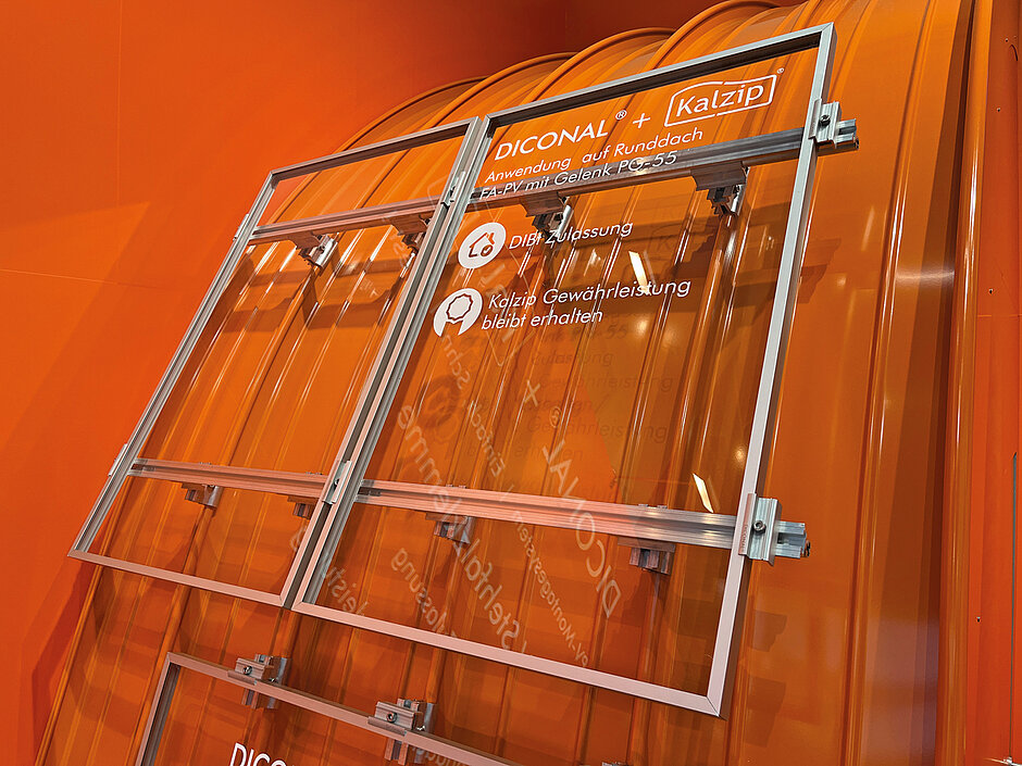 Ein Messehighlight: Die in Zusammenarbeit mit Kalzip entstandene PV-Montagelösung für Kalzip-Dächer wurde auf einem gerundeten und orange beschichteten Dachaufbau präsentiert. Die Kombination aus Kalzip-Original-Befestigungsklemme »FA PV« und dem Diconal-Profilgelenk »PG55« erlaubt eine einfache und flexible Montage von Solaranlagen. Bereits auf einigen Baustellen im Einsatz, zeigten sich auch Besucher interessiert, die das System noch nicht kannten, wie Heiko Zadow, Management PV- und Fassadensysteme bei Kalzip berichtet: »Am Diconal-Stand herrschte reges Interesse. Besonders der gerundete Kalzip-Dachaufbau erregte große Aufmerksamkeit – denn auch hier lassen sich mit den Systemlösungen PV-Anlagen einplanen und einbauen. Gemeinsam mit Diconal konnten wir auf der InterSolar die hervorragende Zusammenarbeit präsentieren.«