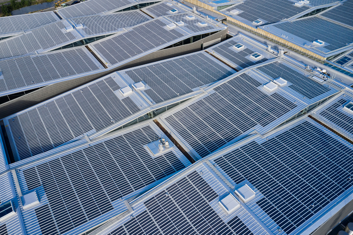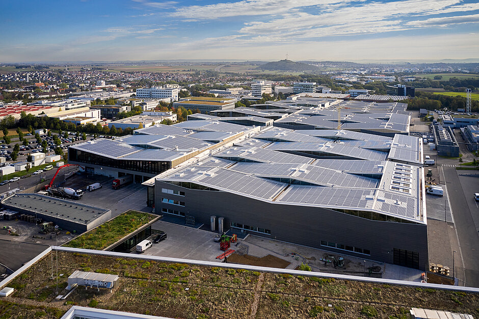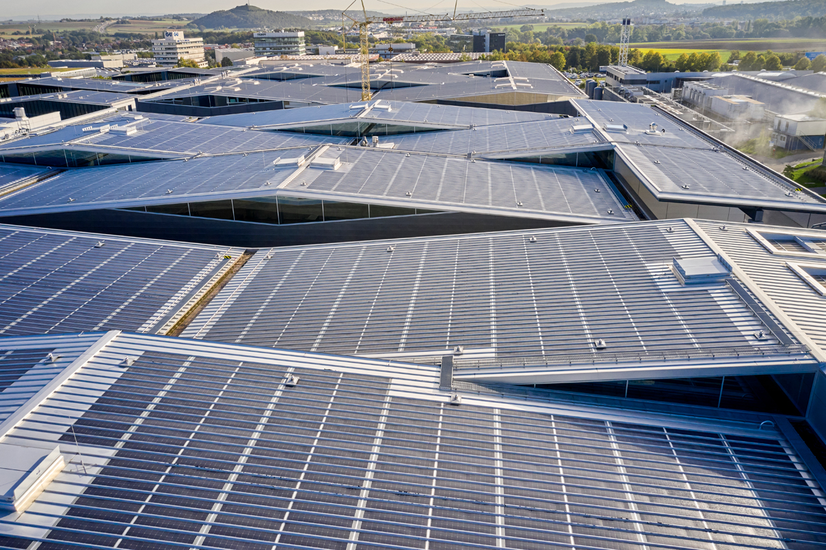 Mit der passgenauen Produktion der Tafeln, einer detailgenauen Bauzeichnung und dem fachgerechten Einbau auf der Baustelle konnte eine gleichmäßige Solardachfläche realisiert werden. Selbst an den Stellen, an denen die Absturzsicherungen montiert wurde, kamen vom Solarmodulhersteller gefertigte Dummys zum Einsatz, um die homogene Optik nicht zu unterbrechen. Die höchstmögliche Auslastung wurde ebenfalls erreicht: Auf den Dachflächen von insgesamt rund 15 200 m2 sind nahezu flächendeckend Solarmodule verbaut worden. Insgesamt rund 10 000 Paneele erreichen eine Leistung von 1 138,5 kWp.