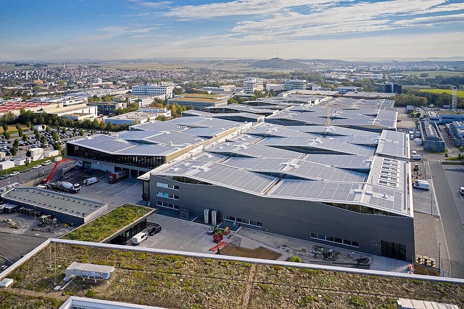 Wie schon für die bereits bestehenden Gebäude am Standort, ist für den Bau der drei neuen Produktionshallen von Trumpf ein ähnliches Design angewandt worden – vor allem für die Dachlandschaft. Die Bedachungselemente lieferte Kalzip. Eine Besonderheit, durch die sich die neuen Produktionshallen vom Bestand unterscheiden: Der größte Teil der Dachflächen ist mit Solarpaneelen bedeckt, die den Standort mit nachhaltig gewonnener Energie versorgen.