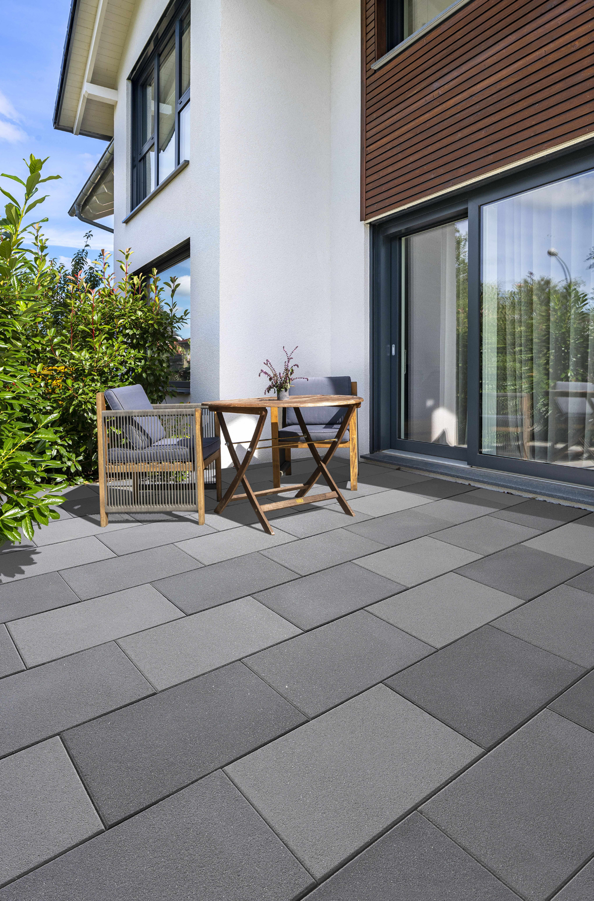 Die Platte »Farly« überzeugt durch ihr vielseitig einsetzbares Rechteckformat und eine feingestrahlte Oberfläche. In Kombination mit edlen Graunuancen wirkt die Flächengestaltung hochwertig und abwechslungsreich. Der Kontrast zwischen den Platten in hellgrau, mittelgrau und dunkelgrau ist in feinen Farbabstufungen aufeinander abgestimmt. Dennoch ergibt sich, gemischt verlegt, eine lebendige Anmutung. Für ein gleichmäßiges Flächenbild erhält jede Graunuance ein Drittel des Flächenanteils. Da die Farbtöne sortenrein verpackt werden, wird der jeweils benötigte Farbanteil einzeln geliefert. Eine Verlegung in uni ist daher auch denkbar. Der Einbau kann in unterschiedlichen Verbänden erfolgen. Zudem entsteht in Kombination mit der schmalen Fase ein besonders gradliniges und schickes Fugenbild.