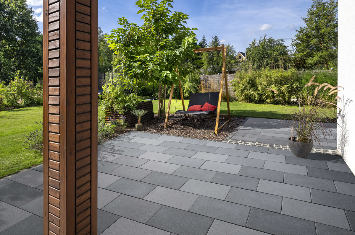 Ist rund ums Haus ein einheitlicher Look geplant, kann Farly gut mit dem Pflastersystem »Nimbus« in ebenfalls drei Grautönen kombiniert werden. So lässt sich der spannende Farbmix in der Flächengestaltung durchgängig bis in den Eingangsbereich fortführen.