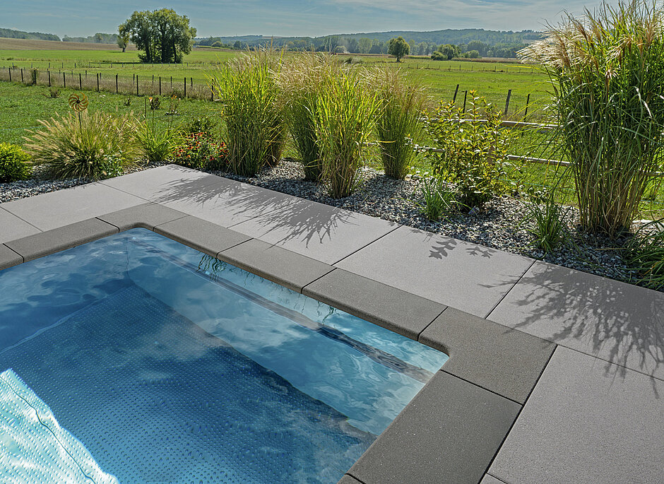 Für immer mehr Gartenbesitzer gehört er zur privaten Wohlfühloase dazu: der eigene Pool. Die hochwertigste und langlebigste Lösung ist ein versenktes, fest eingebautes Becken. Mit der »Vios«-Poolumrandung von Kann lässt sich der Beckenrand genauso sicher wie formschön gestalten und auf einfache Weise in die umgebende Bodenbefestigung integrieren. Zusammen mit »Vios«-Platten oder -Pflaster ergibt sich eine schicke, durchgängige Gesamtlösung.