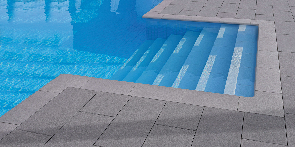 Die Poolumrandung besteht aus einer Normalplatte von 60 x 30 cm, einer Innenecke mit den Abmessungen 45 x 30 x 30 cm und einer Außenecke mit 45 x 30 x 30 cm, jeweils in 4 cm Dicke. Mit ihnen lassen sich neben klassischen Vierseit-Pools auch Beckenvarianten in Winkelform einfassen. Auch Pooleinstiege über eine »Römische Treppe« sind mit den Außenecken einfach umzusetzen.