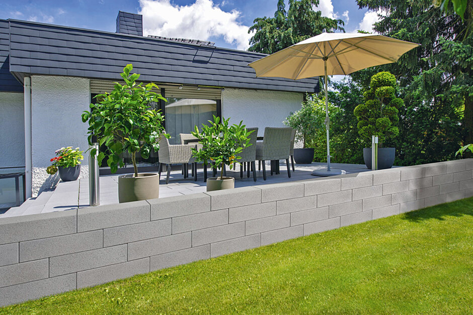 Die neue »Vios«-Mauer ist Teil des gleichnamigen Gestaltungssystems von Kann. Die Anwendungsmöglichkeiten der geradlinigen Mauer sind vielfältig, wie Kann betont, und können dem individuellen Projekt rund um das private Grundstück angepasst werden. Mit den unterschiedlichen Formatgrößen seien sowohl solide Grundstücksmauern und kleinere Böschungsbefestigungen zu realisieren, aber auch gestalterische Objekte wie Beeteinfassungen oder Wasserbecken. Kann bietet die »Vios«-Mauer in zwei unterschiedlichen Grautönen an: feingestrahlt in einem hellen Grau sowie in einem dunkleren Anthrazit. Dank dieser universell einsetzbaren Farbnuancen lassen sich die Elemente mit anderen Farbtönen der »Vios«-Systemfamilie kombinieren.