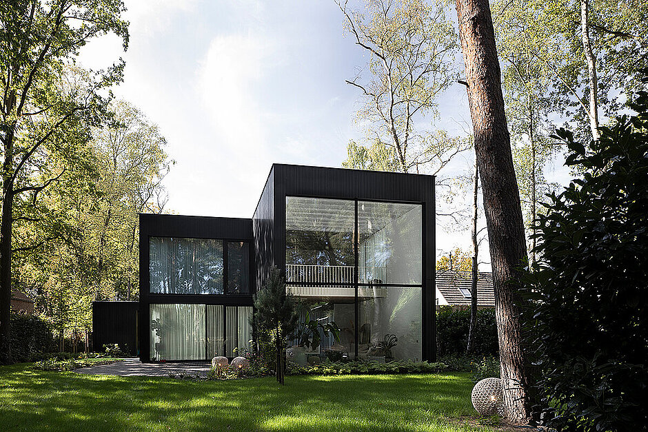 Die tiefschwarze Farbgebung, inspiriert von Shou Sugi Ban (einer Technik des Holzbrandes), verleiht dem Bau eine elegante und reduzierte Präsenz. Der Farbton akzentuiert die präzisen, kantigen Linien der Konstruktion und unterstützt die visuelle Einbettung in das bestehende Landschaftsbild. Die Fassade verschmilzt mit Baumschatten und braunen Stammstrukturen und erzeugt einen subtilen Tarnungseffekt. Gleichzeitig erzeugen großformatige Fensterflächen einen starken Kontrast: Das Innere wirkt lichtdurchflutet, die Glasflächen reflektieren Sonnenstrahlen und unterstützen eine harmonische, nicht störende Integration in den Bestand.