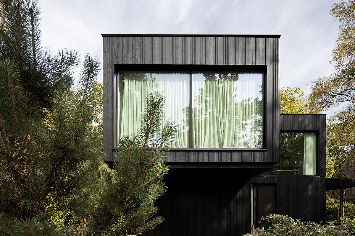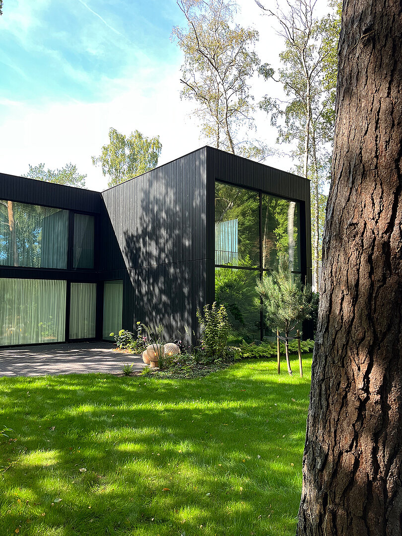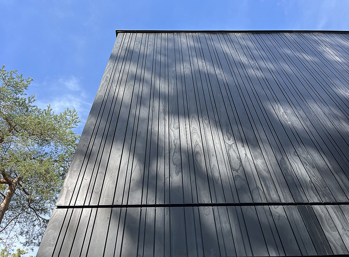 Für die Außenbekleidung wurde schwarzes »Kebony Clear«-Holz ohne sichtbare Äste gewählt, vertikal installiert in 19-x-105-mm-Profilen. Der neue dunkle Farbton und die charakteristische silberne Patina spiegeln den Leitgedanken des Projekts wider: ein zeitgenössischer Rückzugsort, der im Wechsel von Tageslicht und Schatten poetisch wirkt.