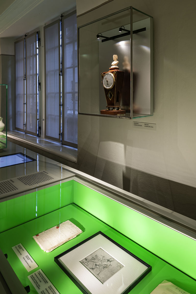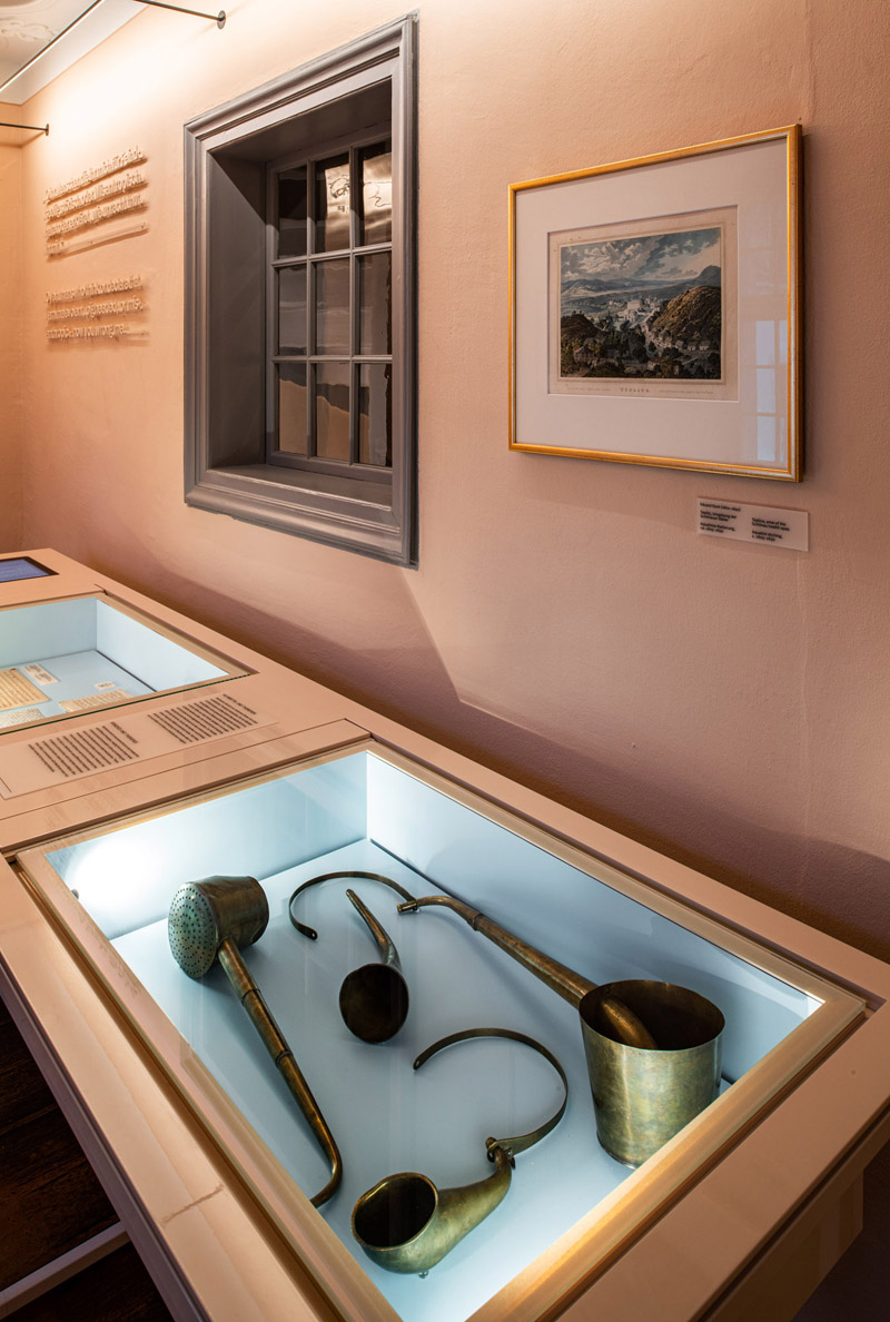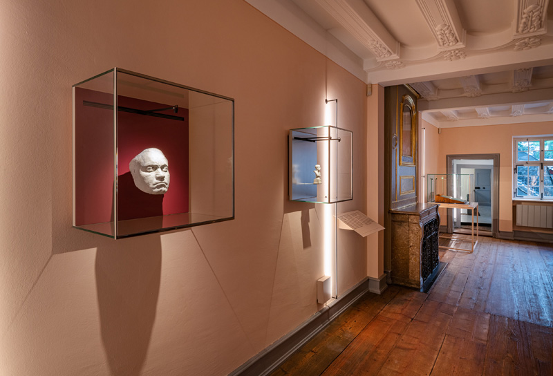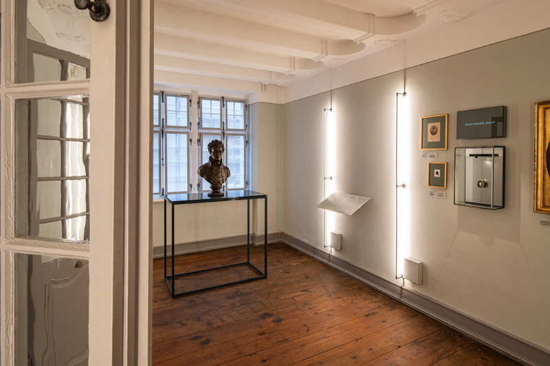 „Also haben wir uns bei der Renovierung auf die Farbtöne gestützt, die auch vorher Verwendung fanden. Die Farbgrundlage ist gleichgeblieben, dies wurde vom Denkmalamt bei der Restaurierung so festgelegt. Jedoch waren die grün-, grau-, blau-grau- und orangefarbenen Pastellfarben an den Wänden sehr vergraut, sodass sie eine Auffrischungskur dringend nötig hatten.“ Auch die Ausstellungsmöbel sind mit der Wandfarbe des jeweiligen Raums abgestimmt und farblich entsprechend monochrom gestaltet. „Die Außenfarbe der Vitrine haben wir den Wänden angepasst,“ erklärt Nicole Kämpken und beschreibt weiter: „Die Einlegeflächen in den Vitrinen heben sich farblich deutlich davon ab. Dabei haben wir auch die präsentierten Themen berücksichtigt und zum Beispiel Rot für das Thema Liebe und Grün für das Thema Natur gewählt.“ Die eleganten Vitrinen und Ausstellungsbauten fügen sich harmonisch in die historischen Räume ein und schaffen einen Bezug zur ursprünglichen Nutzung des Gebäudes als Wohnhaus. Dabei wird das historische Haus selbst als zentrales Ausstellungsstück durch die Farbigkeit der Räume und die Ausstellungsmöbel in Szene gesetzt.