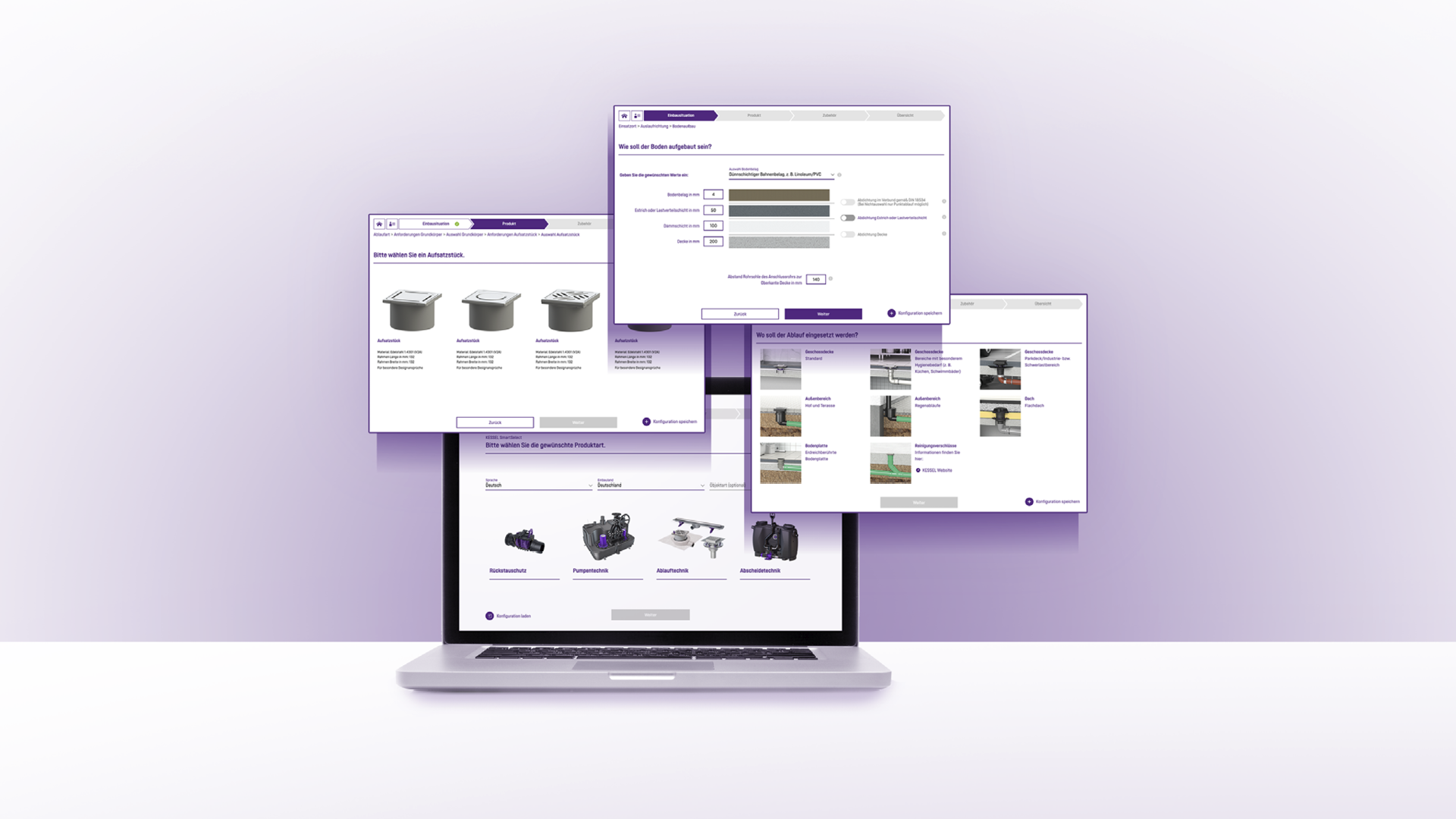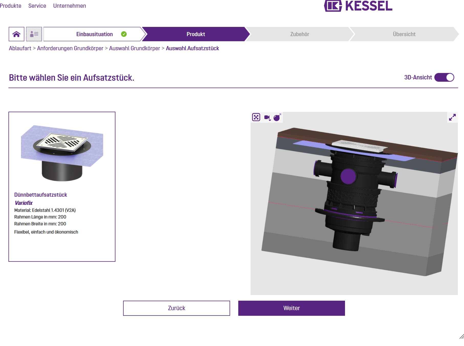 Von der Auswahl des Einbauorts und der Auslaufrichtung über den Bodenaufbau und der gewünschten Abdichtung bis hin zur Wahl des Zubehörs: Der Planungsprozess sei im innovativen 3D-Viewing-Modell für Anwender nun Schritt für Schritt zu beobachten. Fachplaner können so jede einzelne Planungsphase optisch überprüfen und die selektierte Lösung sofort entsprechend der vorliegenden Einbausituation anpassen. Bei jedem Konfigurationsschritt werden die gewählten Angaben zu den Schichten des Bodenaufbaus, Abdichtungsarten und Aufsatzstücken in Echtzeit am Modell veranschaulicht.