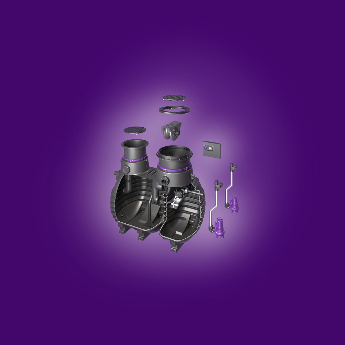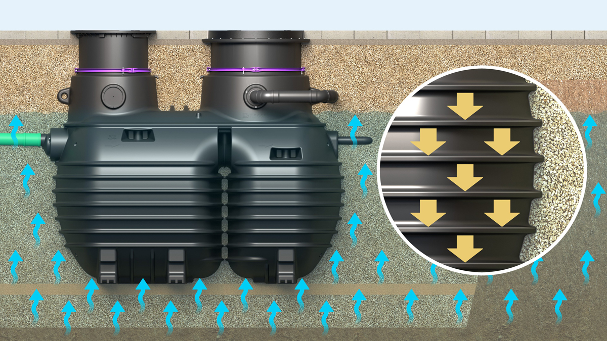 Der neue Zweikammerbehälter wird im Rotationsverfahren aus dauerhaft beständigem Polyethylen (PE) gefertigt. Diese moderne Produktionstechnik ermöglicht eine leichte, hochstabile Konstruktion aus einem Stück. Dank der innovativen Rippenkonstruktion verfügt das System über eine hohe Auftriebssicherheit. Da die Trennwand zwischen Abscheider- und Pumpenbereich nach oben nicht durchgängig ist, sind beide Kammern über die Zugangsöffnung einsehbar.