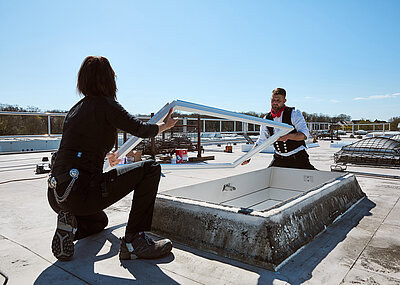 Besondere Herausforderungen ergaben sich beim Einbau der schweren Echtglas-Elemente. Hier kamen Krane und Glassauger zum Einsatz, um die Module präzise auf die Dachfläche zu heben. Das Sattellichtband wurde auf eine bauseitige Zarge gesetzt und sowohl an einem Glasgiebel als auch mit einem Wandanschluss sicher befestigt.