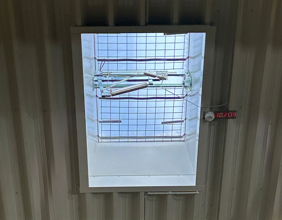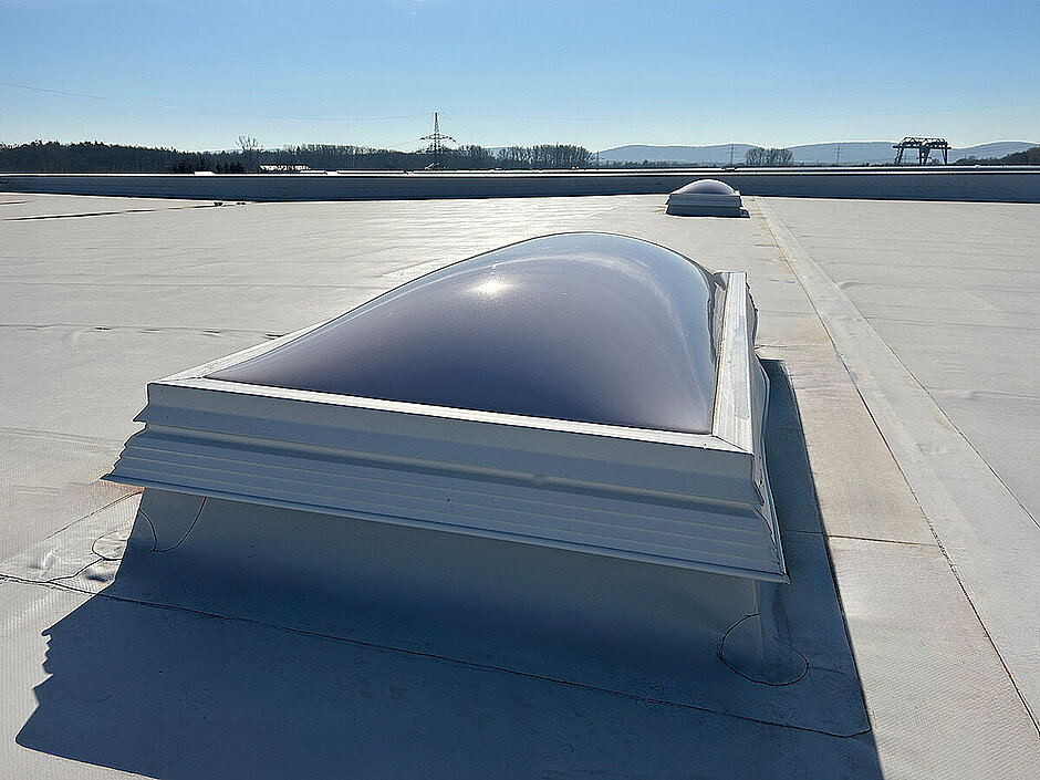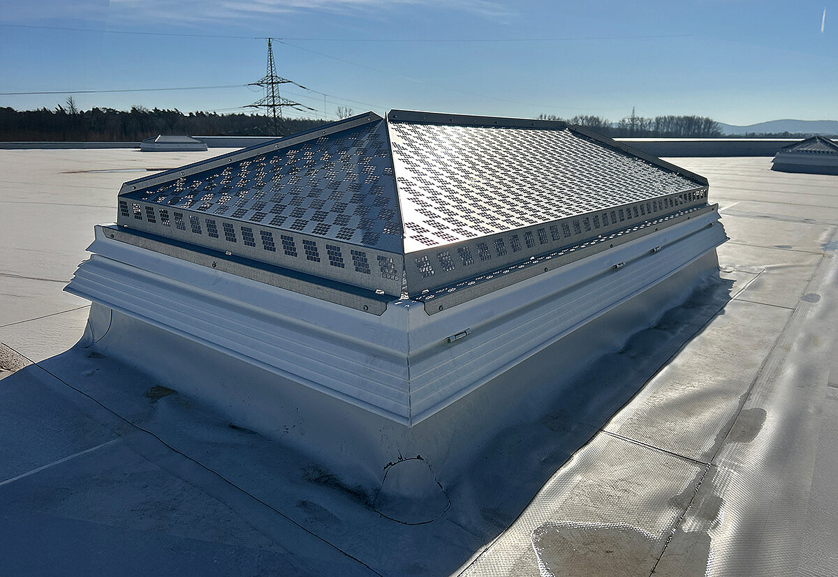 Kingspan Light + Air lieferte hierfür ein abgestimmtes Komplettsystem: »Kingspan Essmann LK classic 120/240«-Lichtkuppeln mit wärmegedämmtem Metall-Aufsetzkranz sorgen für natürliche Belichtung und energetische Effizienz. Rauch- und Wärmeabzugsgeräte (NRWG F6 LK) gewährleisten im Ernstfall eine schnelle Entrauchung. Ergänzt wurden die Lichtkuppeln durch Ab- und Durchsturzsicherungen (RSM) sowie das speziell entwickelte HDS-System zum Schutz gegen Hagel, Durchsturz und Sonneneinstrahlung. Die Notauslösestationen NAS-P vervollständigen die sicherheitstechnische Infrastruktur.