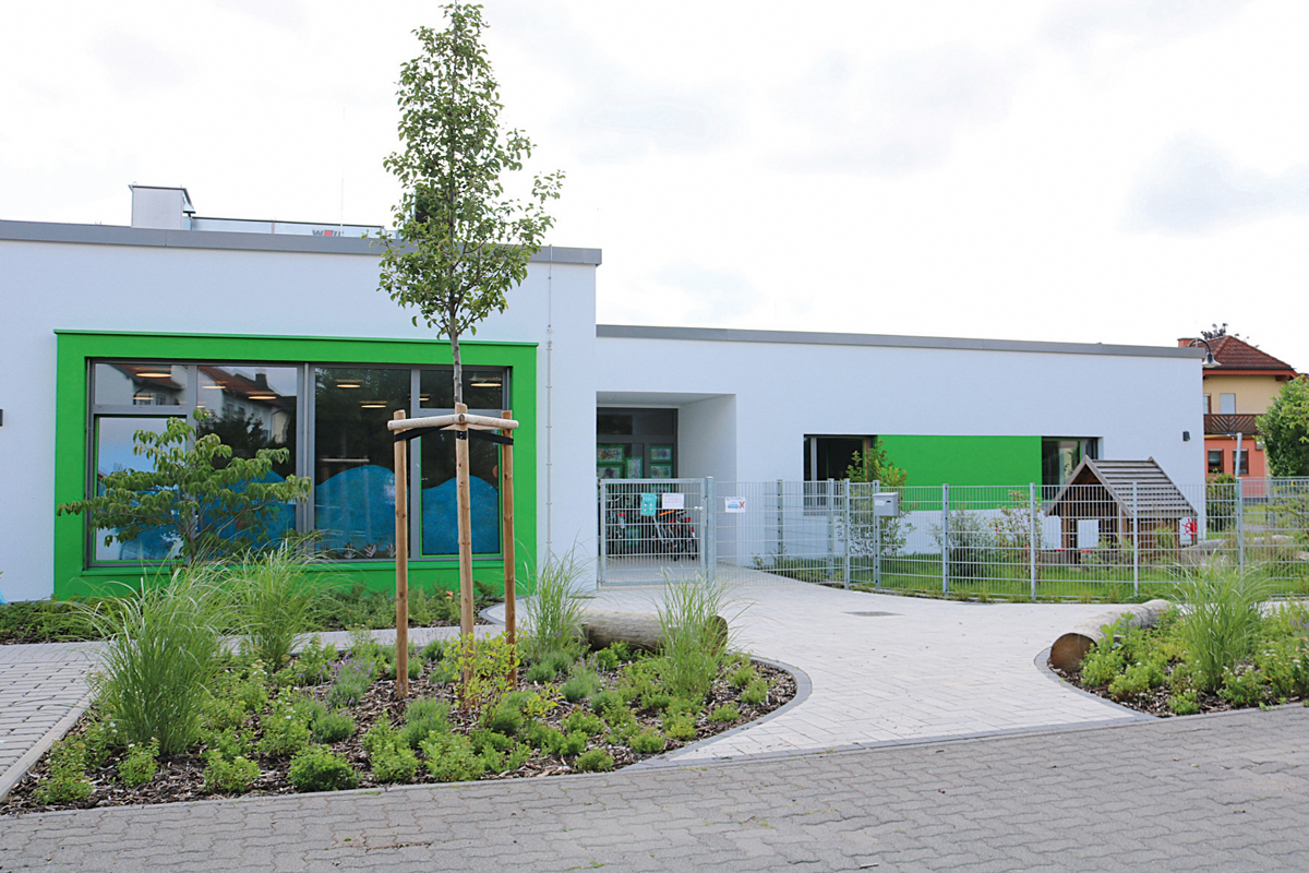 Der für das Außenmauerwerk verwendete »KLB-Plan-Block SW1« ist ein sogenannter Wärmedämmblock, der laut Hersteller über eine herausragende Wärmeleitfähigkeit verfügt. Je nach Rohdichte- und Festigkeitsklasse ermöglicht er den Bau monolithischer Außenwände, die den GEG-Anforderungen an Effizienzhäuser entsprechen. Mit einer Steinstärke von 42,5 cm, 15 mm Innenputz sowie 20 mm konventionellem Silikatputz an der Außenfläche erreichen die Außenwände der Kindertagesstätte einen U-Wert von 0,23 W/(m2K).
