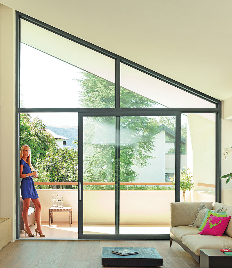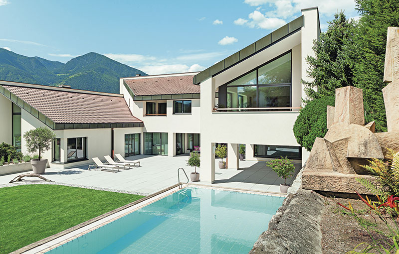 Um Energiekosten zu sparen, den Wohnkomfort zu erhöhen und dabei den Wert seiner Immobilie noch kräftig zu steigern, entschloss sich der Hauseigentümer zum sanften Umbau und zur thermischen Modernisierung. Der italienische KlimaHaus-Gebäudestandard (Casa Clima) ist ein Qualitätssiegel für Wohngebäude – den deutschen Effizienzhausstandards ähnlich – das seine Wurzeln in Südtirol hat und inzwischen im ganzen Land zunehmend an Bedeutung gewinnt. Damit sich der hufeisenförmige Gebäudekomplex mit einem beheizten Bruttovolumen von großzügigen 2 000 m³ de facto in ein Niedrigenergiegebäude verwandeln ließ, waren jedoch einige exakt aufeinander abgestimmte Maßnahmen nötig. Um bei dem Bestandsgebäude die geforderten KlimaHaus-Standards zu erreichen, musste zunächst die Gebäudehülle via Wärmedämmverbundsystem thermisch optimiert werden. Die alte erdölbetriebene Heizungsanlage wurde entfernt und das Gebäude an das Fernwärmenetz angeschlossen. Wesentlicher Bestandteil des stimmigen Energiekonzeptes aber war der Austausch aller am Haus befindlichen Glasflächen: Mit dem Einbau des neuen Fenster- und Türensystems »FIN-Project« und dem Fenster-Wandsystem »Vista« von Finstral konnten hervorragende Wärmedämmwerte erzielt, der solare Wärmeeintrag im Winter maximiert und gleichzeitig ein effektiver sommerlicher Wärmeschutz erreicht werden.Schmale Fensterprofile, hoher Lichteinfall