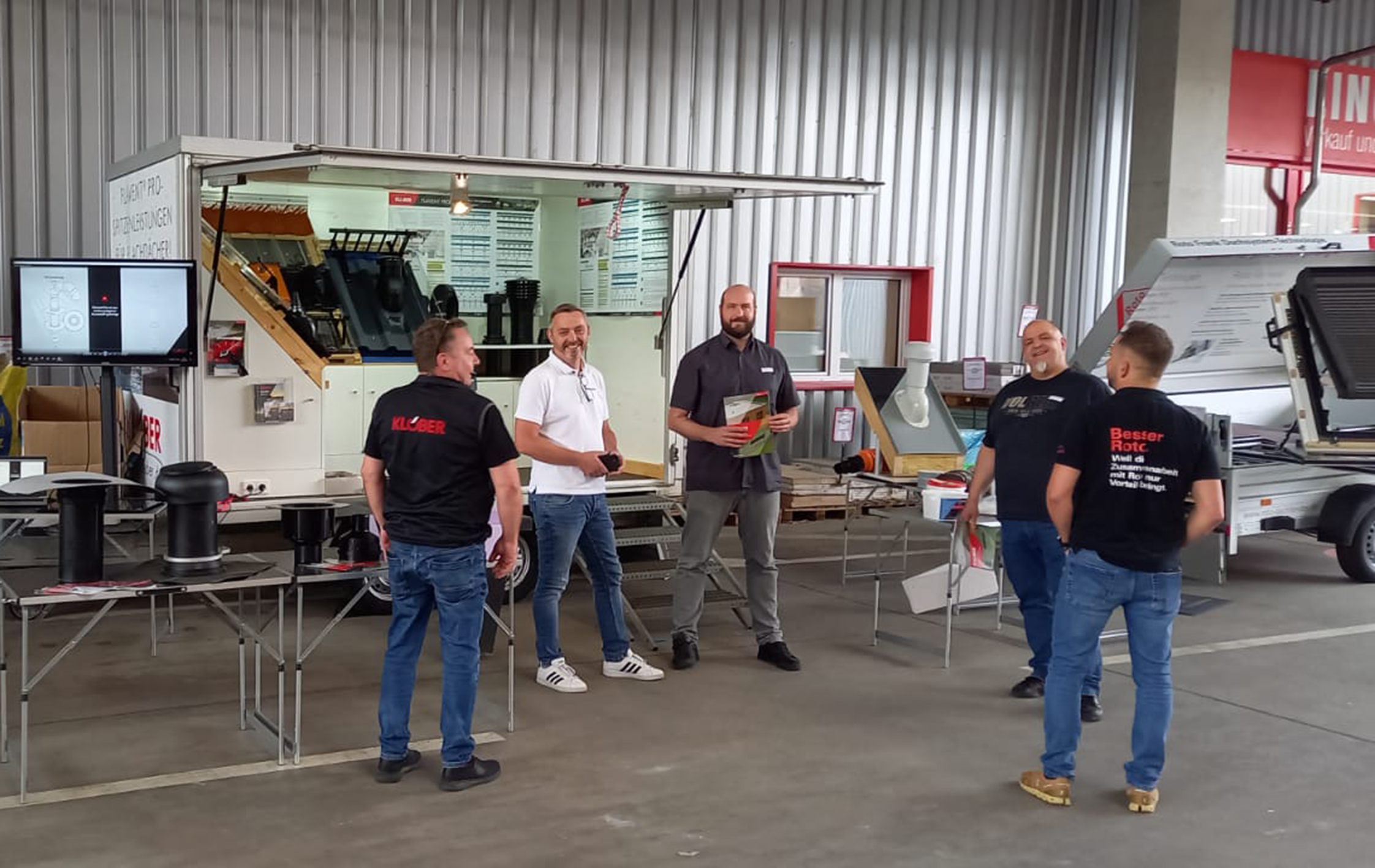 Halt war unter anderem beim Baustoffhändler Götz + Moriz in Lörrach. Axel Ehlenberger von Klöber: „Wir hatten Gelegenheit, den Dachhandwerkern unser Flavent Pro-Sortiment ausführlich vorzustellen. Aber auch das Metalldach-Zubehör sowie Enviroflex, unser Flüssigabdichtungssystem, fanden sehr großes Interesse.“