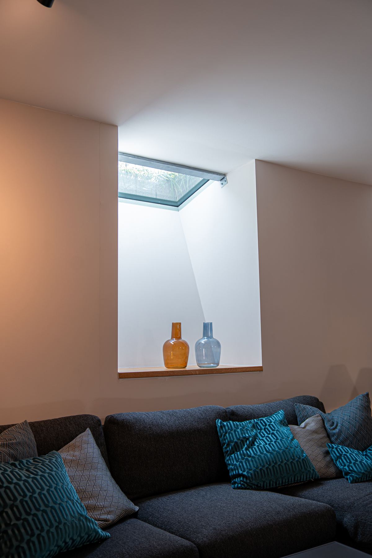 Zum Einsatz kamen bei dem Projekt die Knecht-Lichtfluter mit Brüstung und einer Höhe von 159,5 cm sowie einer Breite von 129 cm. Die Aussparungen in der Kellerwand wurden entsprechend vergrößert. Durch die Brüstung ergibt sich eine praktische Ablagefläche mit einer Tiefe von rund 45 cm, wie bei einer Fensterbank. Nach oben erreicht dieser Lichtfluter eine Tiefe von etwa 110 cm.
