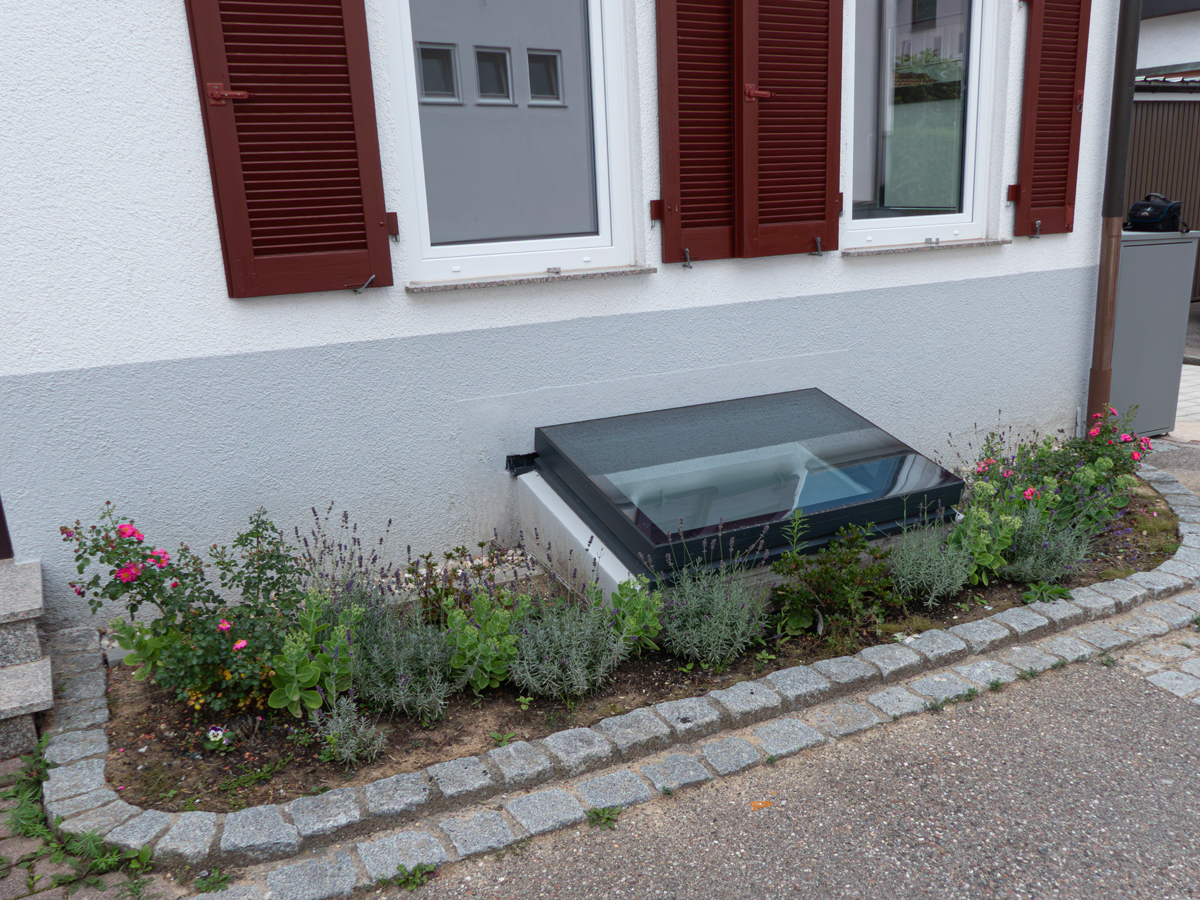Lichtfluter von Knecht sind aus WU-Beton hergestellt und werden montagefertig auf die Baustelle geliefert. Werksseitig angebrachte Ösen erlauben das Einhängen einer Kette und damit das Versetzen per Kran oder Bagger. In Leonberg wurden die Betonfertigteile gegen die Kellerwand gesetzt und die Kontaktstellen mit dem Baukörper verschraubt. Zum Schutz vor drückendem Wasser erfolgte eine bituminöse Schwarzabdichtung. Als Wärmeschutz dient eine Perimeterdämmung.