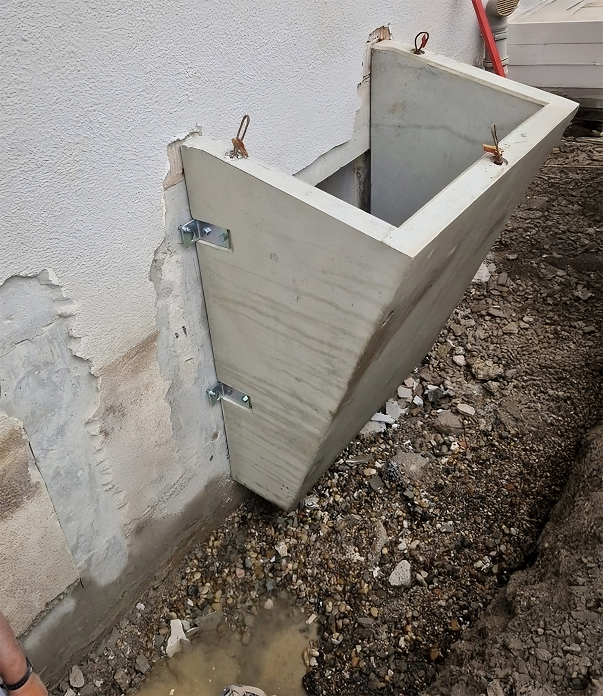 Bei dem Sanierungsprojekt in Leonberg wurde zunächst das Erdreich abgegraben und die Kelleraußenwand an den betreffenden Stellen freigelegt. Eine Herausforderung stellte das hohe Grundwasserniveau dar. Köppke: »Der Keller steht 1,20 m tief im Wasser. Das bedeutete, dass wir die Grube durch ständiges Abpumpen trocken halten mussten, um vernünftig arbeiten zu können.«