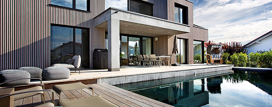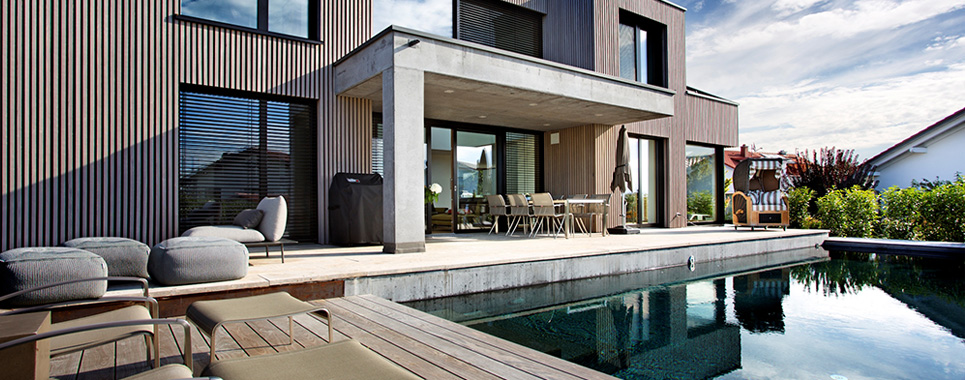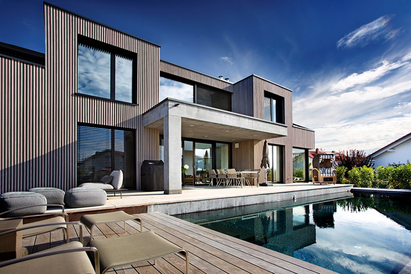 Wem ein großzügiges Panoramafenster als Festverglasung noch nicht genug ist, der ist bei Kneer-Südfenster ebenfalls an der richtigen Adresse. Denn passend zu großflächigen Fenstern und Terrassentüren fertigt das Familienunternehmen aus Westerheim auch Pfosten-Riegel-Fassaden in einem durchgängigen System in der Materialkombination Aluminium-Holz. Mit diesem System lassen sich bis zu sechs Meter hohe transparente Fassaden gestalten – großzügige Terrassentüren perfekt integriert. »Bei Kneer ist nahezu jedes Fenster, jede Tür, jedes Element individuell auf den Kundenwunsch abgestimmt, so auch die Pfosten-Riegel-Fassaden. Die Bauelemente werden mit einer innovativen Aluminium-Außenschale nach Kundenwunsch individuell gefertigt«, berichtet Thomas Reinhard.