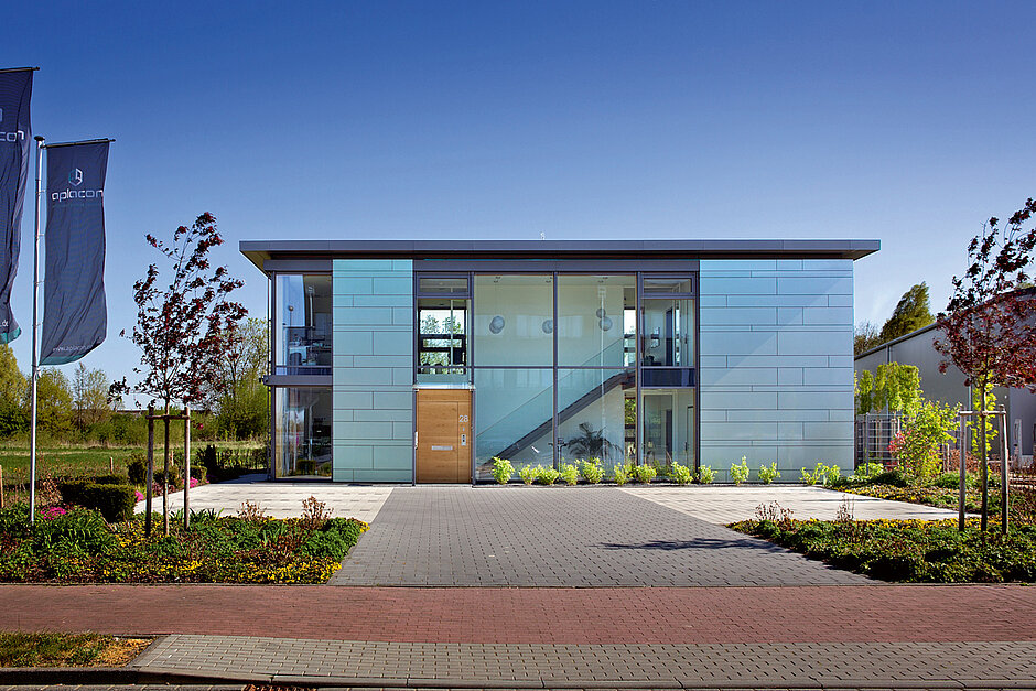Im nordrhein-westfälischen Straelen errichtete die Architektin Gaby Heghmann-Jakobs einen lichtdurchfluteten Neubau für ihr Architekturbüro Aplacon. Das zukünftige Objekt sollte für das fünfköpfige Team durch großzügige Räume auf etwa 300 m2 Bruttogeschossfläche kreatives Arbeiten ermöglichen. Einen kompetenten Umsetzungspartner für ihre Vorstellungen fand die Architektin und Bauherrin direkt in ihrer Nachbarschaft: René Legère, Fachbetrieb für Fenster und Türen, schlug den Einsatz großzügiger Pfosten-Riegel-Fassaden mit 3-fach-Verglasung von Kneer-Südfenster vor. Diese Lösung bietet einen sehr guten Schall- und Einbruchschutz und erzielt eine hohe Dämmwirkung.