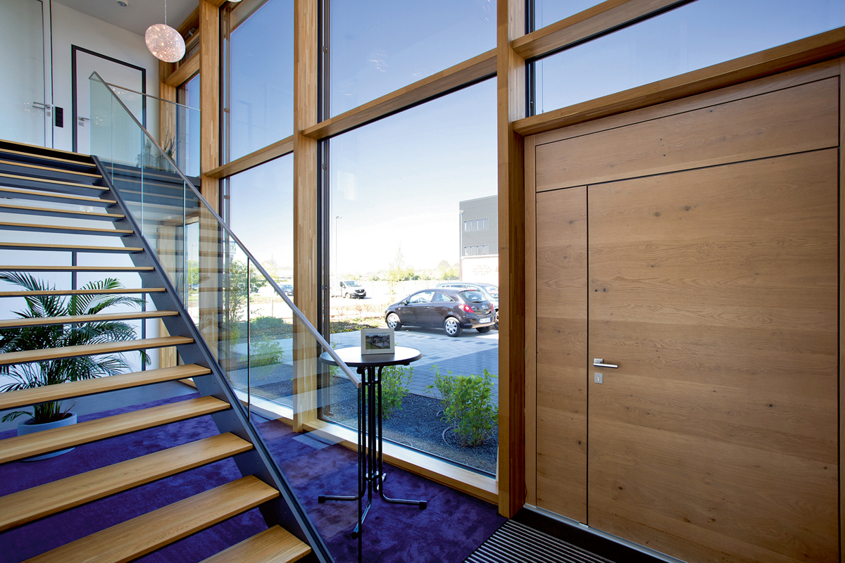 Es entstand ein zweistöckiger Baukörper mit einem überstehenden und durch eine umlaufende LED-Lichtleiste beleuchteten Flachdach, das teilweise begrünt ist. Zur hochwertigen Gestaltung und Ausstattung des Gebäudes gehören modernste Haus- und Energietechnik, eine gut gedämmte Aluminium-Carbon-Fassade sowie mehrere, rundum integrierte Pfosten-Riegel-Fassaden. Mit fast 200 m2 machen die Pfosten-Riegel-Konstruktionen 62 Prozent der gesamten Fassadenfläche aus. Die Anschlüsse der Pfosten-Riegel-Konstruktionen zum Rohbau wurden umlaufend wasser- und luftdicht sowie wärmedämmend ausgebildet. »Ich habe mich für die Pfosten-Riegel-Fassade von Kneer-Südfenster entschieden, weil hier wertiges Holz mit größter Sorgfalt verarbeitet ist. Das Eichenholz im Innenbereich wird kombiniert mit witterungsbeständigem Aluminium im Außenbereich, und darüber hinaus ist die Form der Profile überaus schlank und filigran«, berichtet Gaby Hegmann-Jakobs. Aufgrund der geringen Profilstärke von 6 cm sind die Pfosten und Riegel aus keilgezinkter Eiche 18 cm tief und erzielen eine spannende Raumwirkung.