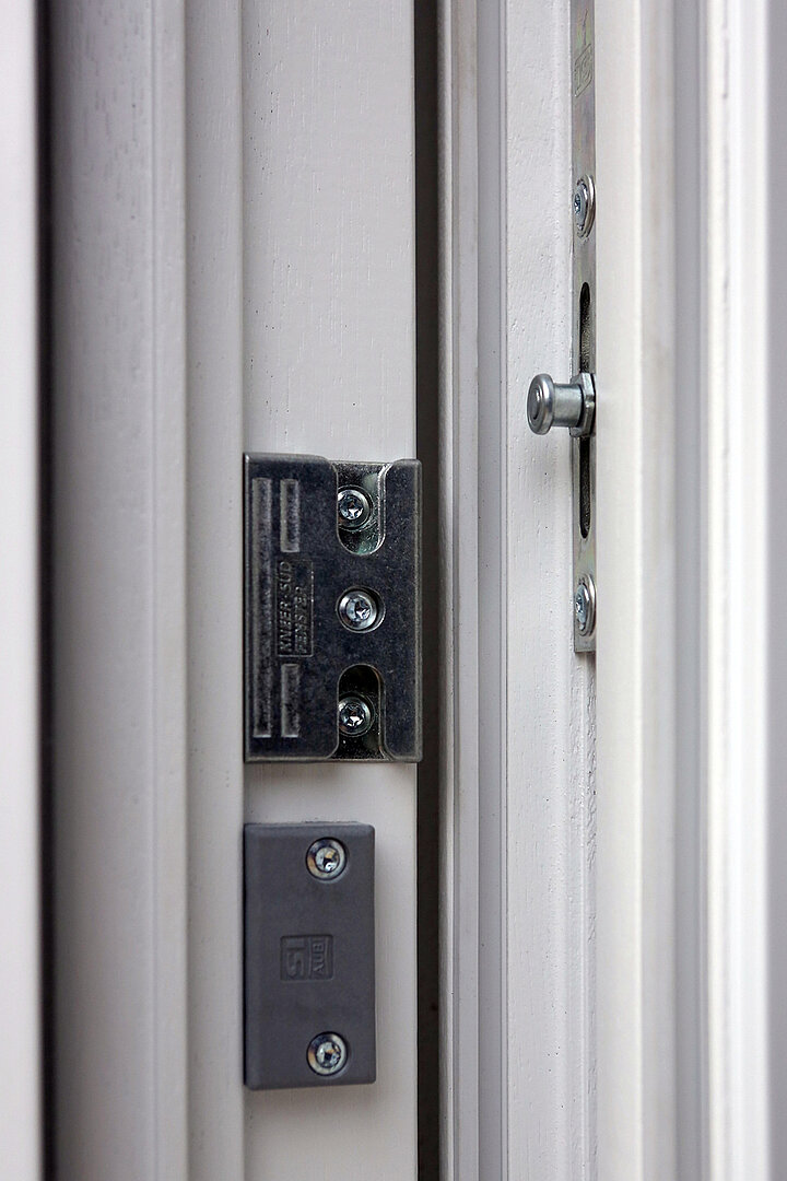 Bei Haustüren kombiniert Kneer-Südfenster mechanische Sicherheitssysteme mit intelligenter Technik. Schon in der Standardausführung sorgt ein patentierter Keilfalz auf der Bandseite dafür, dass sich die Tür nicht aushebeln lässt. Türen der Klasse RC 2 verfügen zusätzlich über eine automatische Mehrfachverriegelung, die beim Zuziehen der Tür selbsttätig einrastet – die Tür ist also immer abgeschlossen, ohne dass jemand daran denken muss.