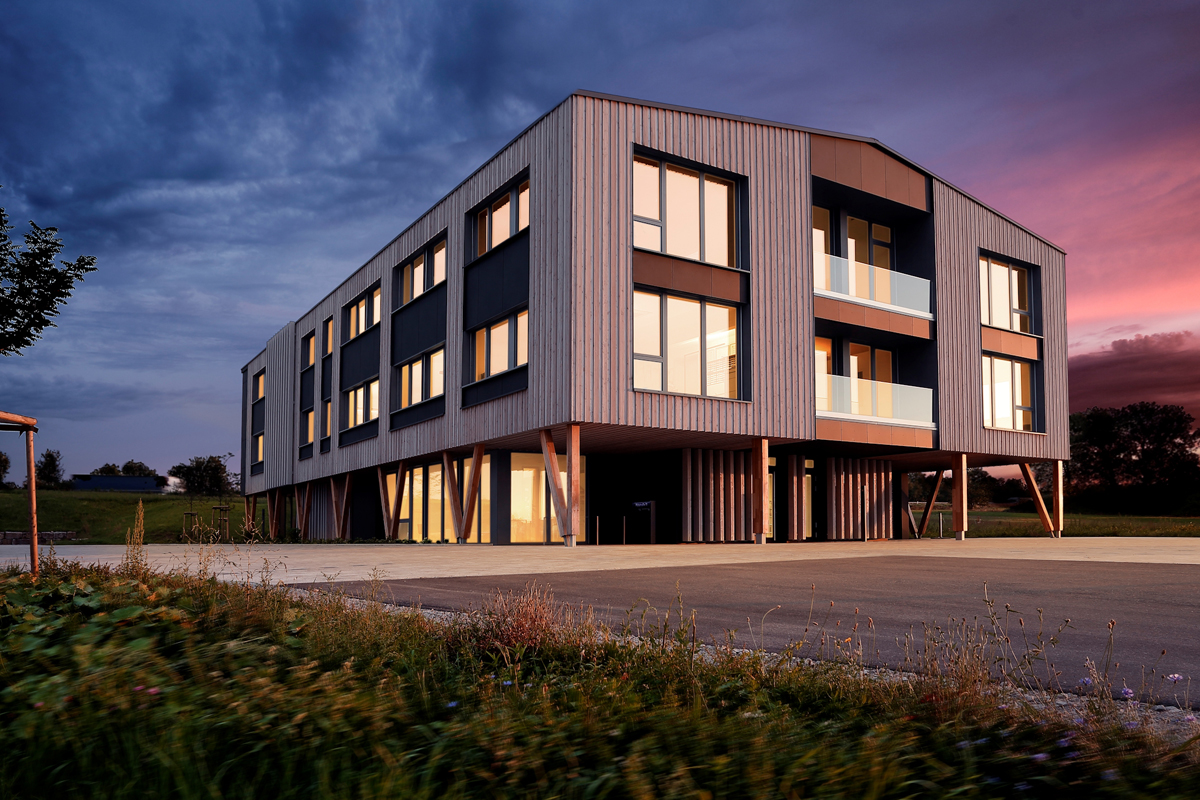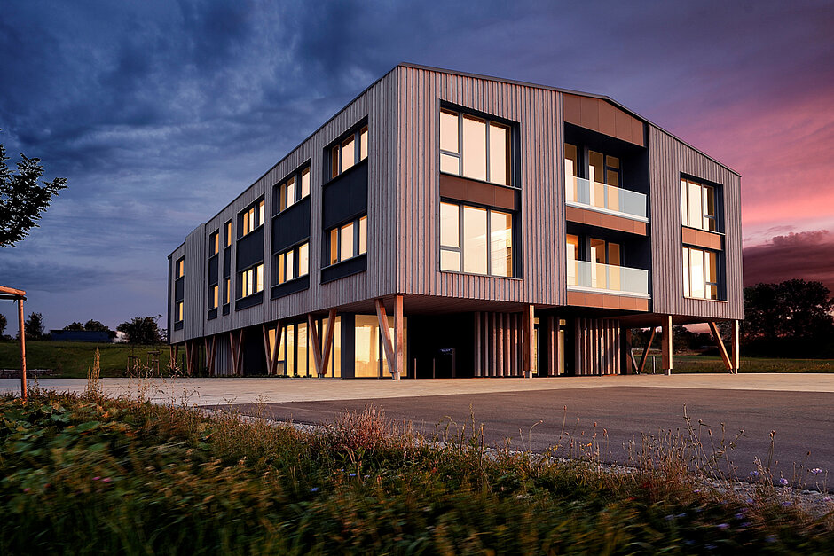Wer als Holzbau-Unternehmen mit 140-jähriger Erfahrung ein eigenes Neubauprojekt angeht, plant und baut mit besonderen Ansprüchen und Zielsetzungen. Exakt so entstand das neue Bürogebäude. Wie selbstverständlich fügt es sich heute in sein Umfeld mit den beiden bestehenden Fertigungshallen von Bauer Holzbau, die Natur und die Nachbarbebauung ein – als ein mustergültiges Beispiel für zukunftsorientiertes, ökologisches gewerbliches Bauen in ländlichen Regionen.