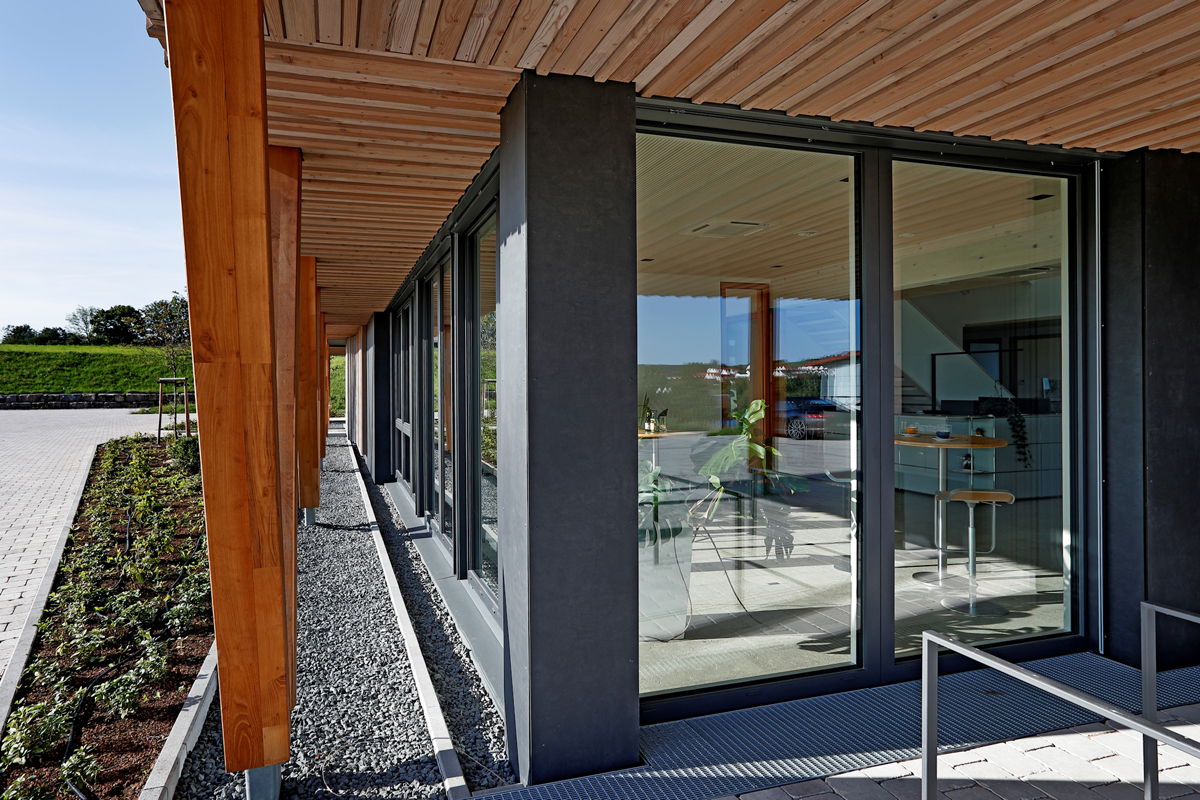 Der Büroneubau befindet sich nur wenige hundert Meter entfernt von den Werkhallen von Bauer Holzbau. Deshalb wagte der Bauherr diesmal ein Experiment: Er fertigte die Elemente seines neuen Gebäudes in maximalen Übergrößen mit bis zu 20 m Länge und 5 m Höhe. Die überdimensionalen Elemente haben sich problemlos direkt vor Ort mit Hilfe eines Baukrans aufstellen lassen. Alle Fenster und Eingangstüren von Kneer-Südfenster waren schon fix und fertig in den Holzständerwänden integriert. »Ein Projekt mit solch außergewöhnlichen Dimensionen gelingt dann, wenn die sonst erforderlichen Transportwege über eine Autobahn entfallen«, berichtet Martin