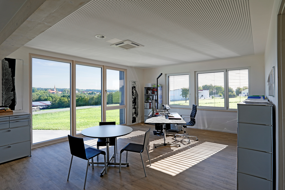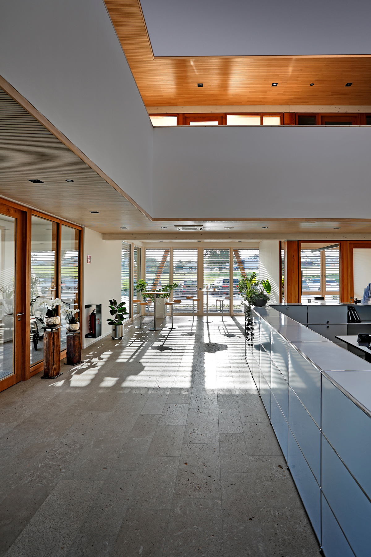 Tageslicht ist die Hauptlichtquelle im Neubau – dadurch wird der Energiebedarf minimiert, die Räume sind angenehm hell. Durch Oberlichter strömt das Sonnenlicht ins Atrium, große Fensterflächen erhellen die Büros und Besprechungsräume der rund 55 Mitarbeiter.