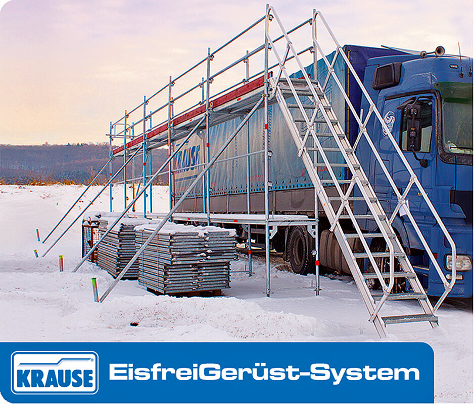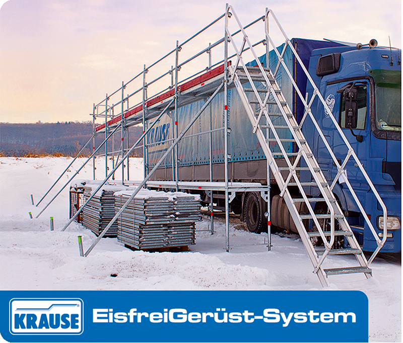 besonders bei den widrigen Wetterbedingungen im Herbst und Winter. Mit dem Eisfreigerüst bietet Krause Fahrern und Unternehmern die Möglichkeit, diesen Unfällen und den verbundenen Haftungsrisiken vorzubeugen. Darüber hinaus ermöglicht es eine schnelle und sichere Reinigung der Dachflächen und der seitlichen Bordwände oder Planen.