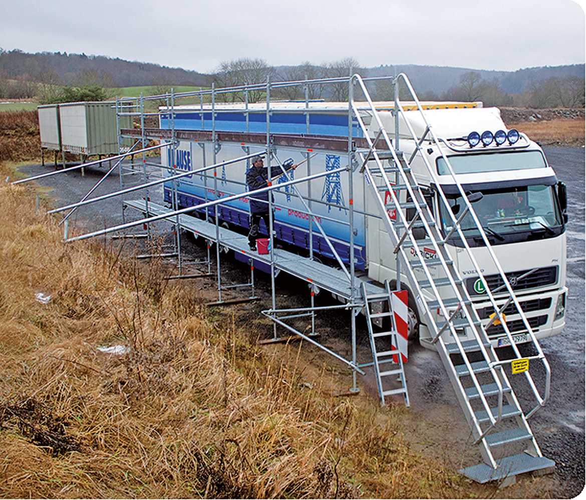 Das laut Hersteller robuste und wartungsfreie Eisfreigerüst-System kann auch in den Sommermonaten aufgebaut bleiben und bietet die Möglichkeit, Reinigungs- und Wartungsarbeiten am Lkw durchzuführen und wird von zahlreichen Verbänden und Organisationen empfohlen. J